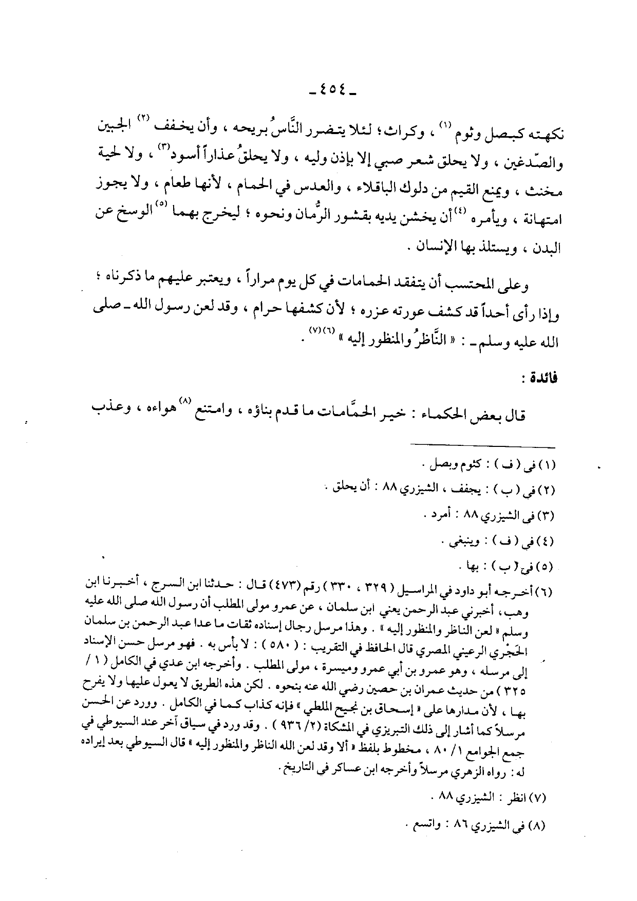 وعلى المحتسب لأن يتفقد الحمامات في كل يوم مراراً، ويعتبر عليهم ما ذكرناه؛ وإذا رأى أحداً قد كشف عورته عزره؛ لأن كشفها حرام، وقد لعن رسول الله - صلى الله عليه وسلم -: "الناظر والمنظور إليه".