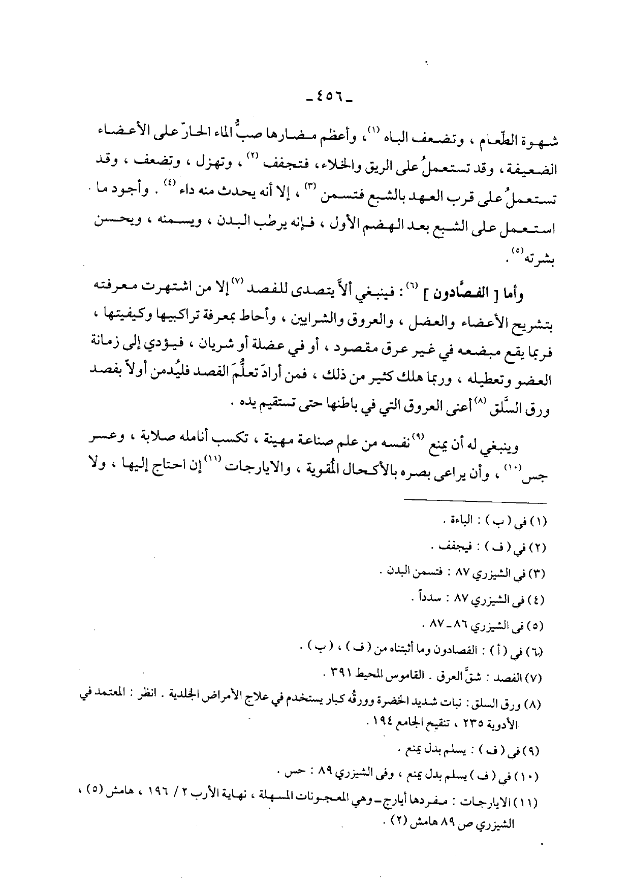 وأما [الفصادون]: فينبغي ألا يتصدى للفصد إلا من اشتهرت معرفته بتشريح الأعضاء والعضل، والعروق والشرايين، وأحاط بمعرفة تراكيبها وكيفيتها، فربما يقع مبضعه في غير عرق مقصود، أو في عضلة أو شريان، فيؤدي إلى زمانة العضو وتعطيله، وربما هلك كثير من ذلك، فمن أراد تعلم الفصد فليدمن أولاً بفصد ورق السلق أعنى العروق التي في باطنها حتى تستقيم يده.