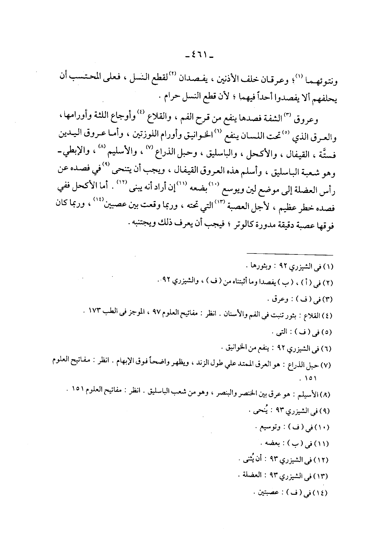 وعروق الشفة فصدها ينفع من قرح الفم, والقلاع وأوجاع اللثة وأورامها, والعرق الذي تحت اللسان ينفع الخوانيق وأورام اللوزتين, وأما عروق اليدين فستة, القيفال. والأكحل, والباسليق, وحبل الذراع, والأسليم, والإبطي - وهو شعبة الباسليق, وأسلم هذه العروق القيفال, ويجب أن يتنحى في فصده عن رأس العضلة إلى موضع لين ويسع بضعه إن أراد أنه بيني, أما الأكحل ففي فصده خطر عظيم, لأجل العصبة التي تحته, وربما وقعت بين عصيين, وربما كان فوقها عصبة دقيقة مدورة كالوتر؛ فيجب أن يعرف ذلك ويجتنيه.