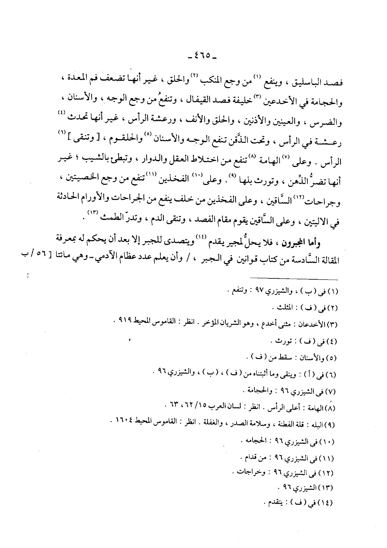 وأما المجبرون, فلا يحل لمجير يقدم ويتصدى للجبر إلا بعد أن يحكم له بمعرفة المقالة السادسة من كتاب قوانين في الجبر, / وأن يعلم عدد عظام الآدمي - وهي ماتتا [56 / ب