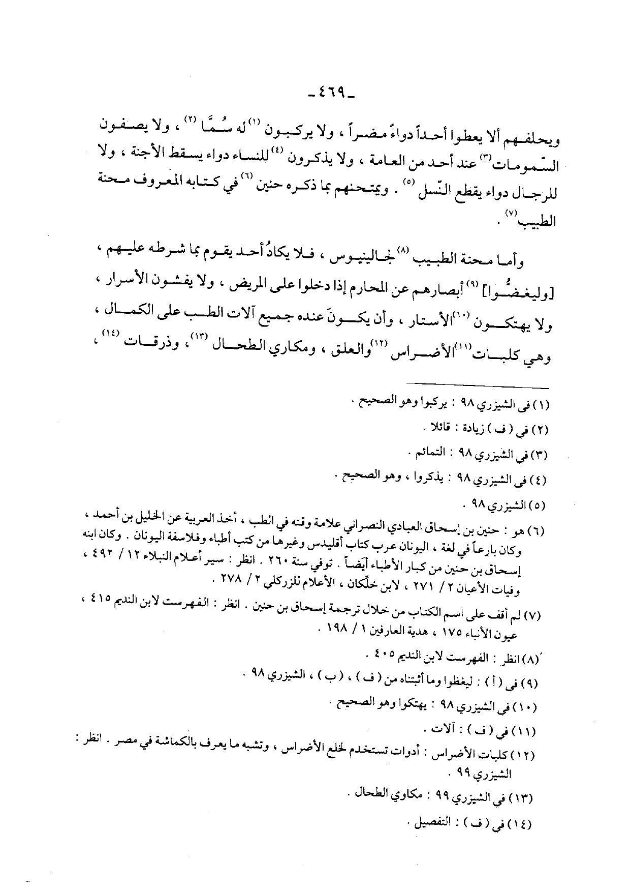 وأما محنة الطبيب لجالينيوس, فلا يكاد أحد يقوم بما شرطه عليهم, [وليغضوا] أبصارهم عن المحارم إذا دخلوا على المريض, ولا يفشون الأسرار, ولا يهتكون الأستار, وأن يكون عنده جميع آلات الطب على الكمال, وهي كلبات الأضراس والعلق, ومكاري الطحال, وذرقات,