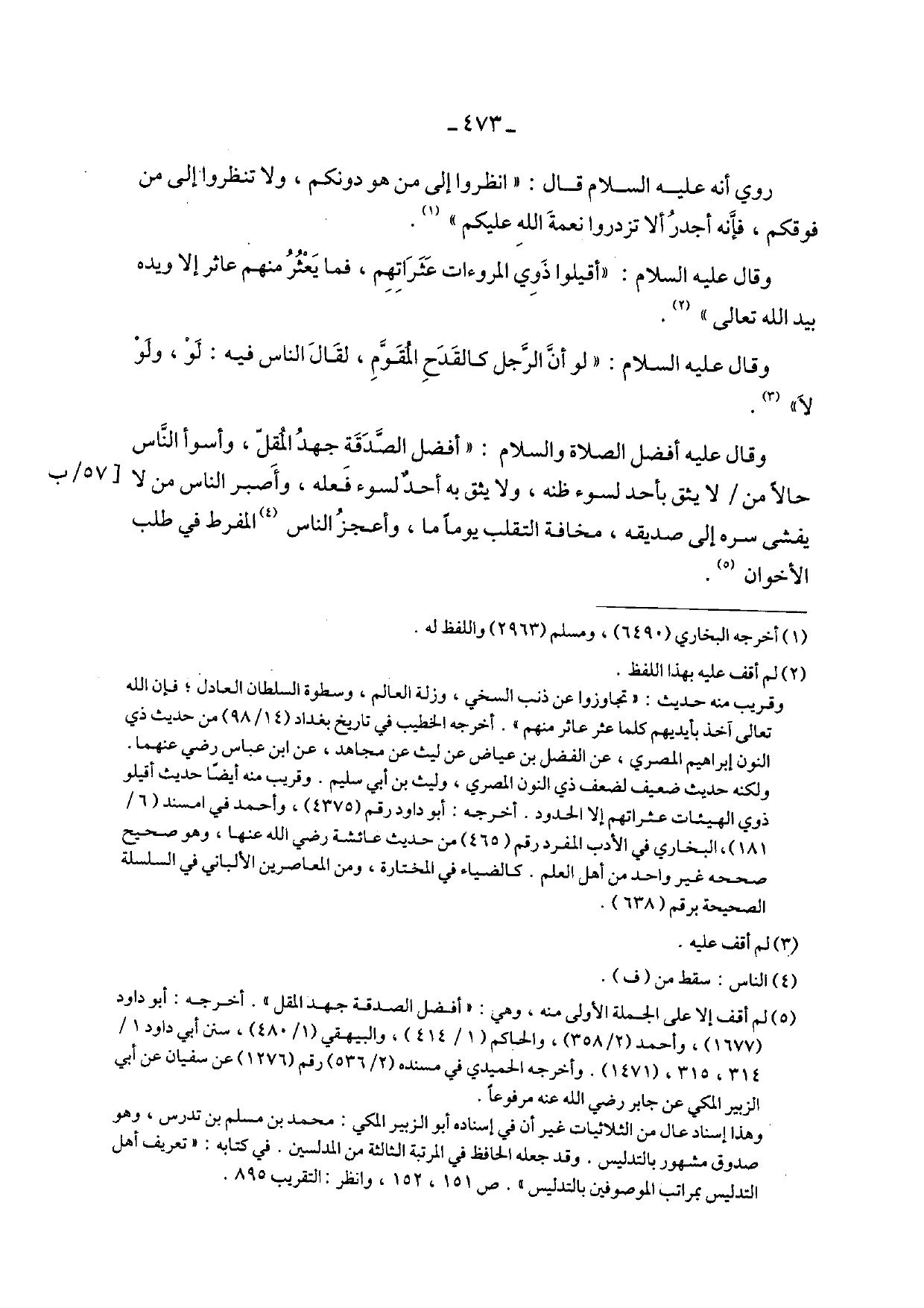 وقال عليه أفضل الصلاة والسلام: "أفضل الصدقة جهد المقل، وأسوأ الناس حالاً من / لا يثق بأحد لسوء ظنه، ولا يثق به أحدٌ لسوء فعله، وأصبر الناس من لا يفشى سره إلى صديقه، مخافة التقلب يوماً ما، وأعجز الناس المفرط في طلب الأخوان.