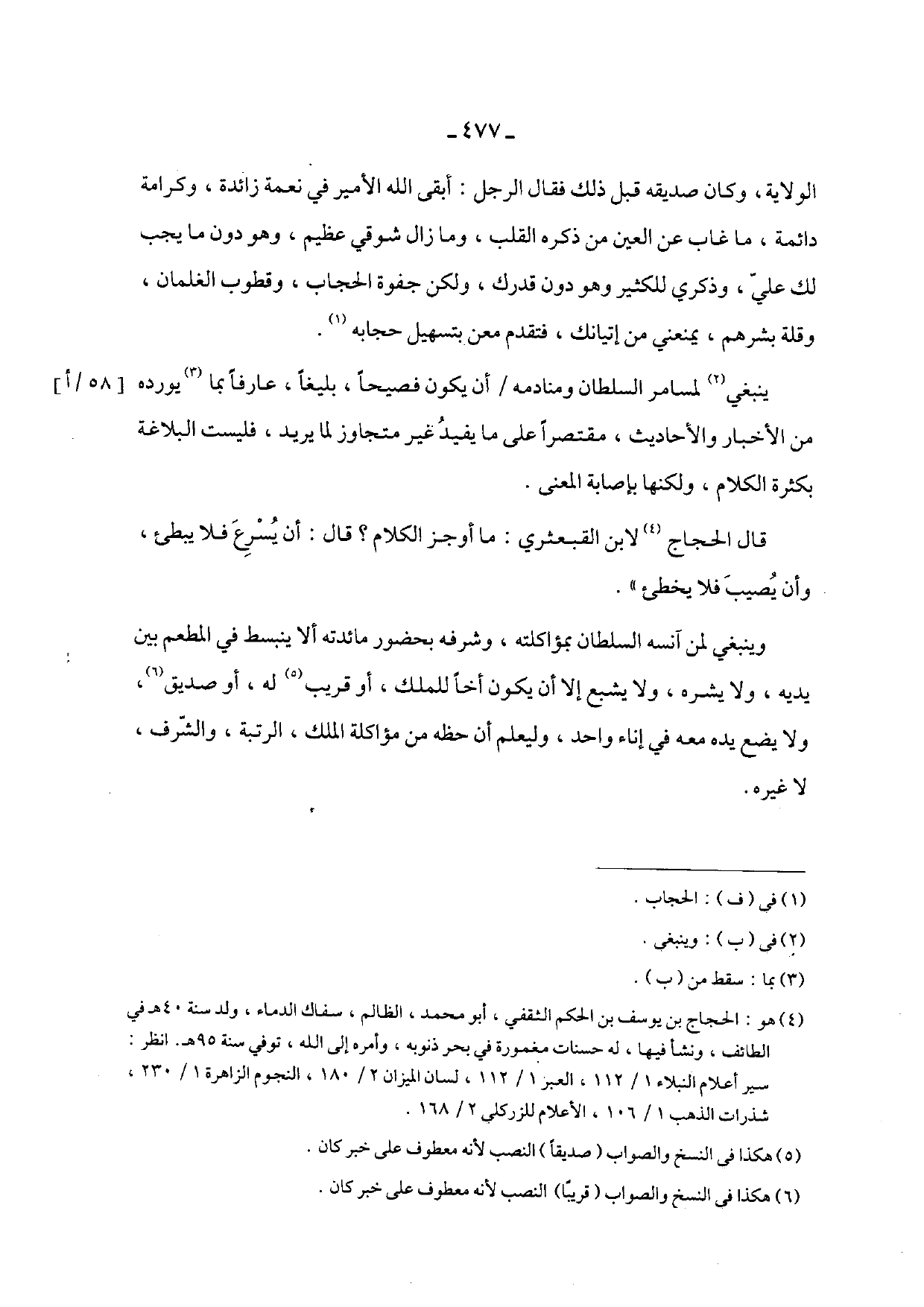 ينبغي لمسامر السلطان ومنادمه / أن يكون فصيحًا، بليغًا، عارفًا بما يورده من الأخبار والأحاديث، مقتصرًا على ما يفيد غير متجاوز لما يريد، فليست البلاغة بكثرة الكلام، ولكنها بإصابة المعنى.