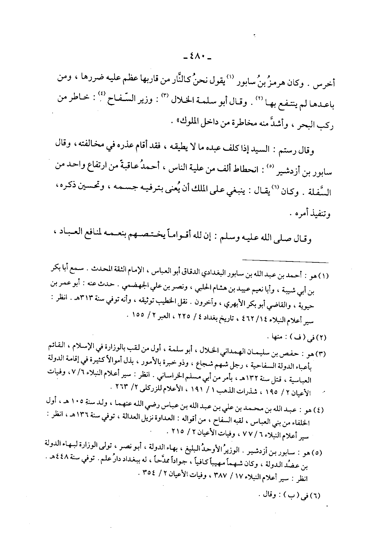 أخرس. وكان هرمز بن سابور يقول نحن كالنار من قاربها عظم عليه ضررها، ومن باعدها لم ينتفع بها. وقال أبو سلمة الخلال: وزير السفاح: خاطر من ركب البحر، وأشد منه مخاطرة من داخل الملوك".