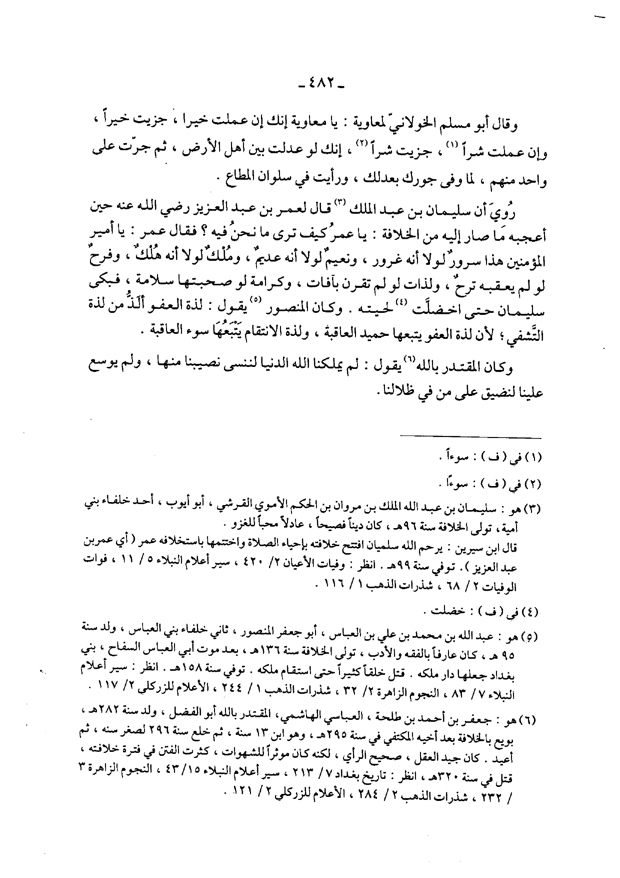 روي أن سليمان بن عبد الملك قال لعمر بن عبد العزيز رضي الله عنه حين أعجبه ما صار إليه من الخلافة: يا عمر كيف ترى ما نحن فيه؟ فقال عمر: يا أمير المؤمنين هذا سرورٌ لولا أنه غرور، ونعيمٌ لولا أنه عديمٌ، وملكٌ لولا أنه هلكٌ، وفرحٌ لو لم يعقبه ترحٌ، ولذات لو لم تقرن بآفات، وكرامة لو صحبتها سلامة، فبكى سليمان حتى اخضلت لحيته. وكان المنصور يقول: لذة العفو ألذ من لذة التشفي؛ لأن لذة العفو يتبعها حميد العاقبة، ولذة الانتقام يتبعها سوء العاقبة.