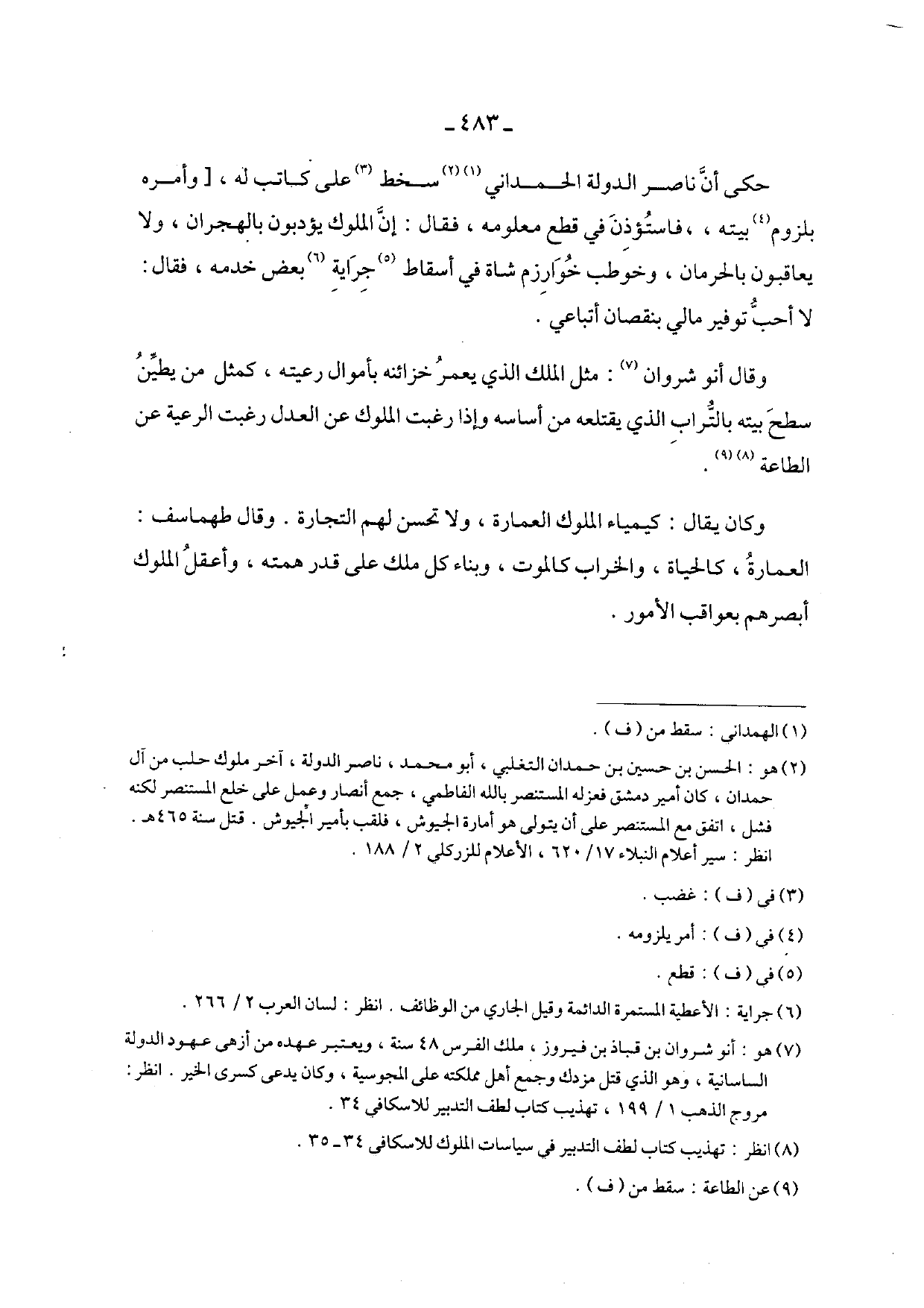 حكى أن ناصر الدولة الحمداني سخط على كاتب له، [وأمره بلزوم بيته، فاستؤذن في قطع معلومه، فقال: إن الملوك يؤدبون بالهجران، ولا يعاقبون بالحرمان، وخوطب خوارزم شاة في أسقاط جراية بعض خدمه، فقال: لا أحب توفير مالي بنقصان أتباعي.