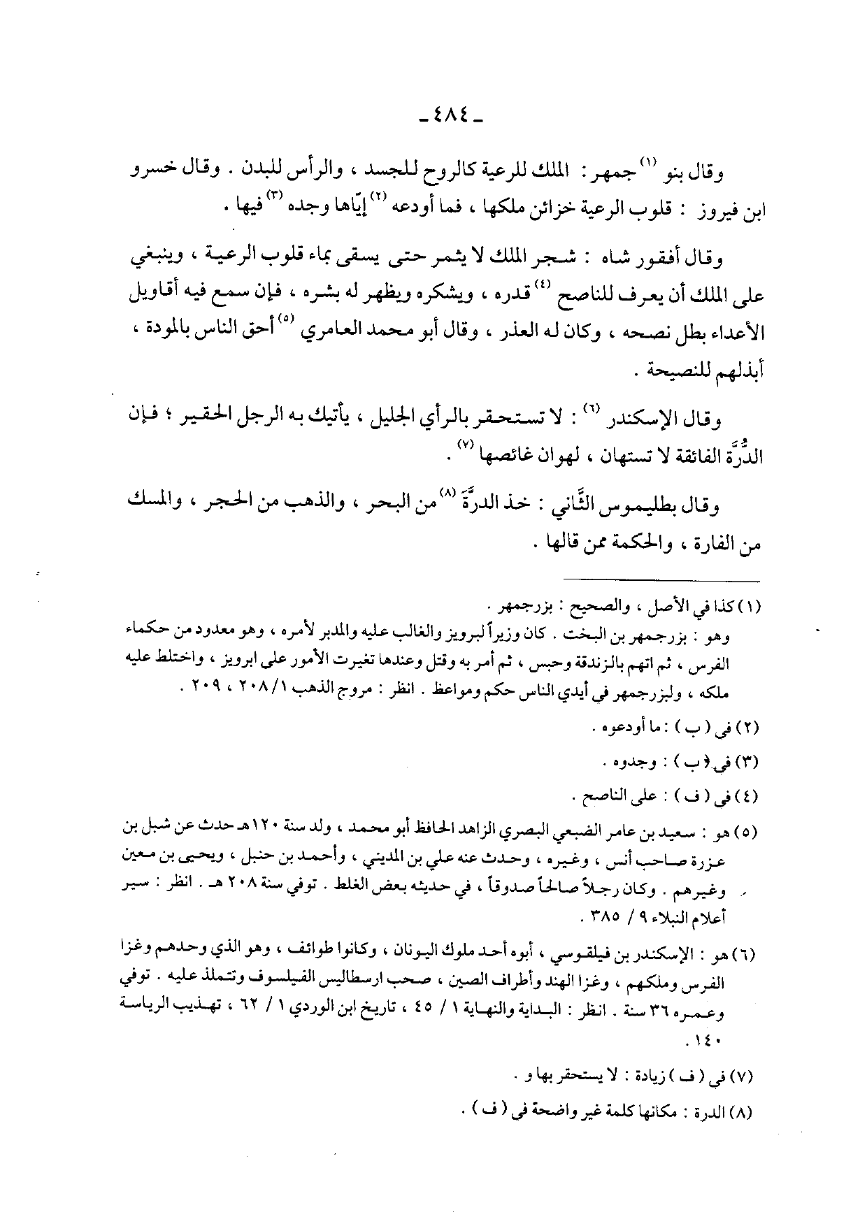 وقال أفقور شاه: شجر الملك لا يثمر حتى يسقى بماء قلوب الرعية، وينبغي على الملك أن يعرف للناصح قدره، ويشكره ويظهر له بشره، فإن سمع فيه أقاويل الأعداء بطل نصحه، وكان له العذر، وقال أبو محمد العامري أحق الناس بالمودة، أبذلهم للنصيحة.