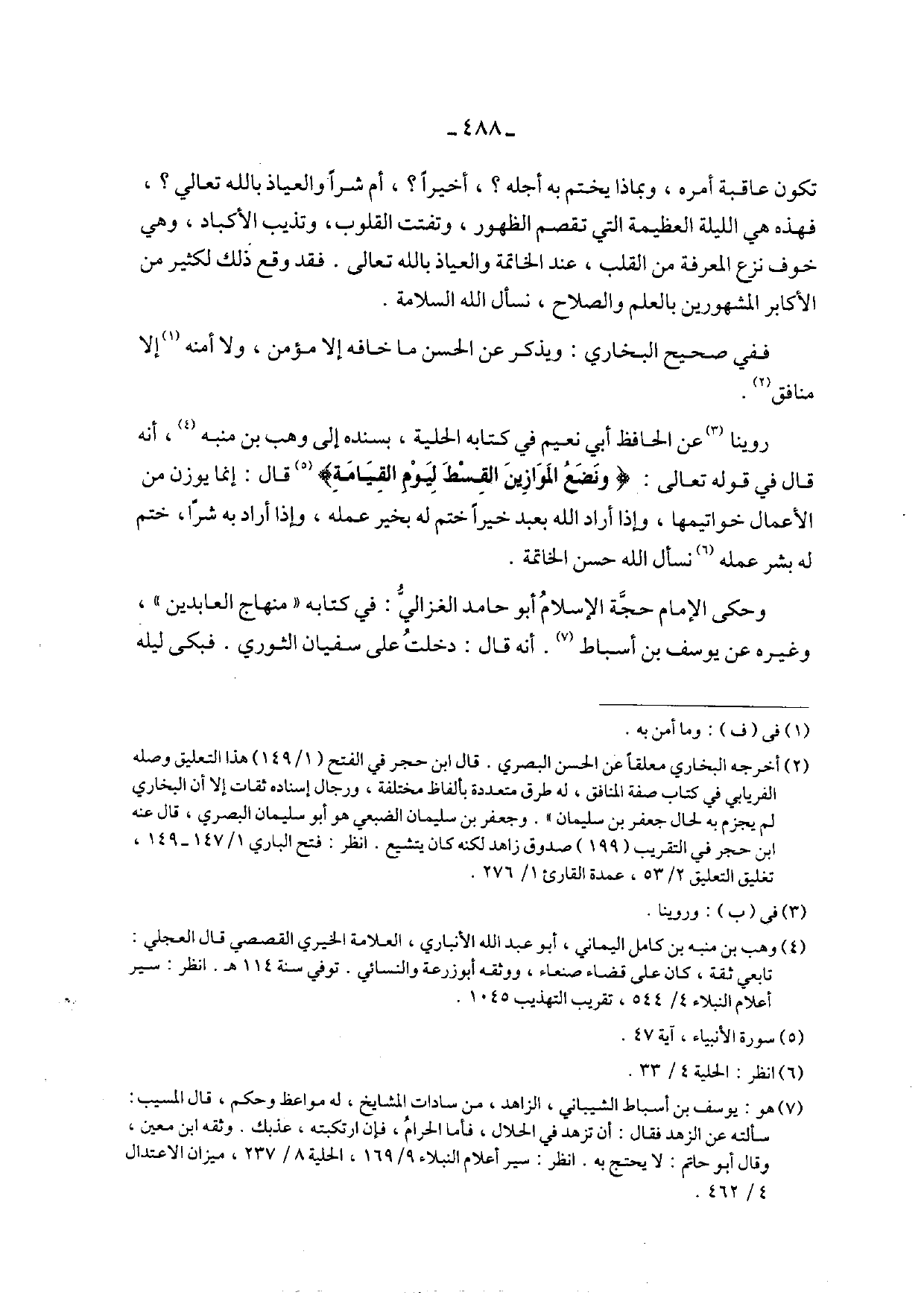 تكون عاقبة أمره، وبماذا يختم به أجله؟ ، أخيرًا؟ ، أم شرًا والعياذ بالله تعالى؟ ، فهذه هي الليلة العظيمة التي تقصم الظهور، وتفتت القلوب، وتذيب الأكباد، وهي خوف نزع المعرفة من القلب، عند الخاتمة والعياذ بالله تعالى. فقد وقع ذلك لكثير من الأكابر المشهورين بالعلم والصلاح، نسأل الله السلامة.