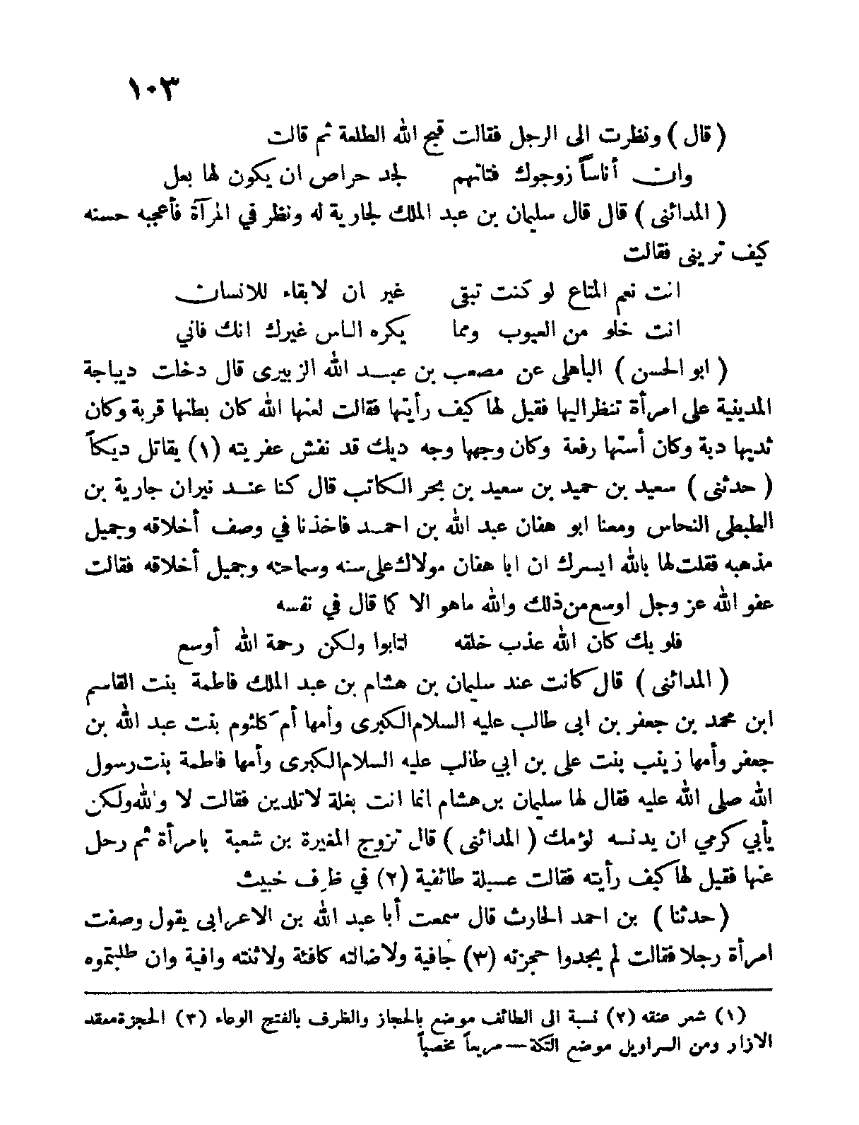 " المدائني " قال كانت عند سليمان بن هشام بن عبد الملك فاطمة بنت القاسم بن محمد بن جعفر بن أبي طالب عليه السلام الكبرى وأمها أم كلثوم بنت عبد الله بن جعفر وأمها زينب بنت عليّ بن أبي طالب عليه السلام الكبرى وأمها فاطمة بنت رسول الله صلى الله عليه وسلم فقال سليمان بن هشام لها إنما أنت بعلة لا تلدين فقالت لا والله ولكن يأبى كرمي أن يدنسه لؤمك " المدائني " قال تزوج المغيرة بن شعبة بامرأة ثم رحل عنها فقيل لها كيف رأيته فقالت عسيلة طائفية في ظرفٍ خبيث.