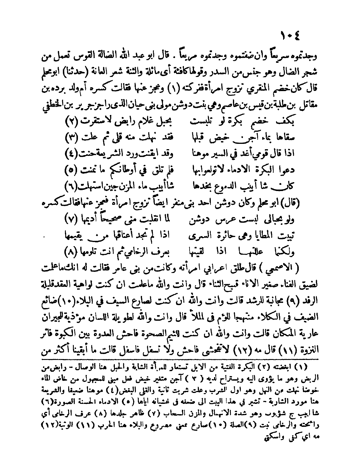 قال أبو عبد الله الضالة القوس تعمل من شجر الضال وهو جنس من السدر وقولها كافئة أي مائلة والثنة شعر العانة " حدثنا " أبو محلم قال كان خضم المنقري تزوج امرأة ففركته وعجز عنها فقالت كسر أم ولد برده بن مقاتل بن طلبة بن قيس بن عاصم وهي بنت دوشن مولى بني حيان الذي راجز جرير بن الخطفي: