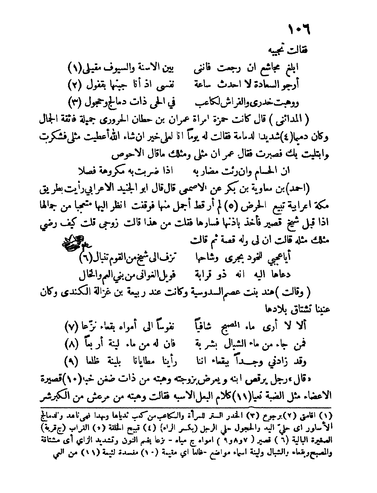 " أحمد " بن معاوية بن بكر عن الأصمعي قال قال أبو الجنيد الأعرابي رأيت بطريق مكة أعرابية تبيع الحرض لم أرَ قط أجمل منها فوقفت أنظر إليها متعجباً من جمالها إذ أقبل شيخٌ قصير فأخذ بأذنها فسارها فقلت من هذا قالت زوجي قلت كيف رضي مثلكِ مثله قالت إن لي قصة ثم قالت: