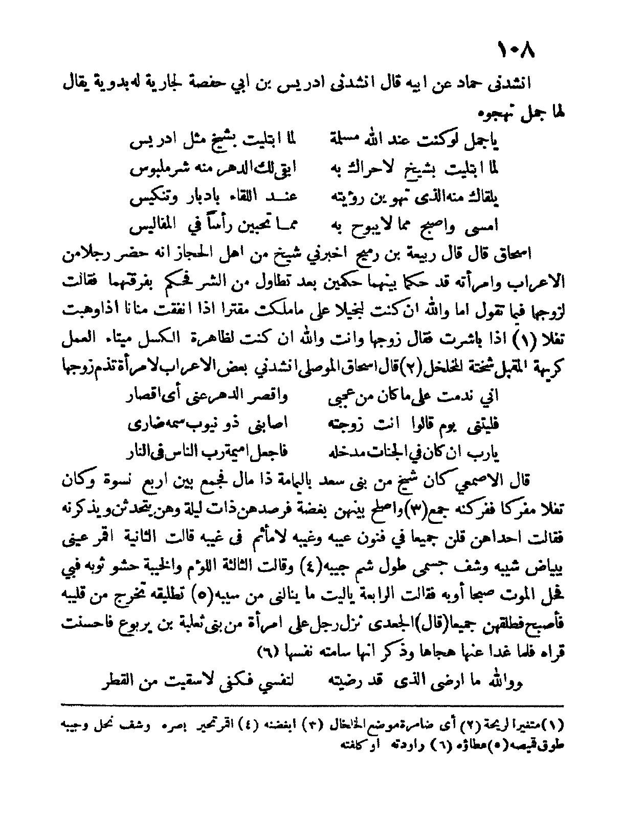 إسحاق قال قال ربيعة بن رميح أخبرني شيخٌ من أهل الحجاز أنه حضر رجلاً من الأعراب وامرأته قد حكما بينهما حكمين بعد تطاول من الشر فحكم بفرقتهما فقالت لزوجها فيما تقول أما والله إن كنت بخيلاً على ما ملكت مقتراً إذا أنفقت مناناً إذا وهبت تفلاً إذا باشرت فقال زوجها وأنت والله إن كنت لظاهرة الكسل ميتاء العمل كريهة المقبل شختة المخلخل " قال " إسحاق الموصلي أنشدني بعض الأعراب لامرأة تذم زوجها: