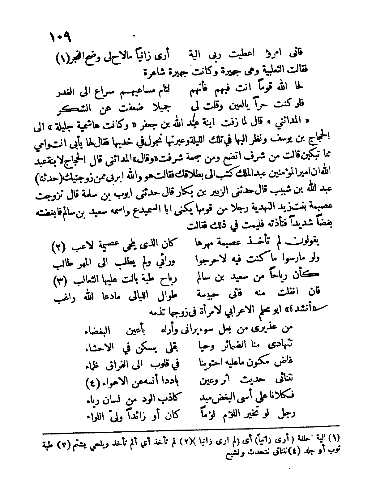 " وقال المدائني " قال الحجاج لابنة عبد الله أن أمير المؤمنين عبد الملك كتب إليّ بطلاقك فقالت هو والله أبر بي ممن زوجنيك " حدثنا " عبد الله بن شبيب قال حدثني الزبير بن بكار قال حدثني أيوب بن سلمة قال تزوجت عصيمة بنت زيد النهدية رجلاً من قومها يكنى أبا السميدع واسمه سعيد بن سالم فأبغضته بغضاً شديداً فتأذته فليمت في ذلك فقالت: