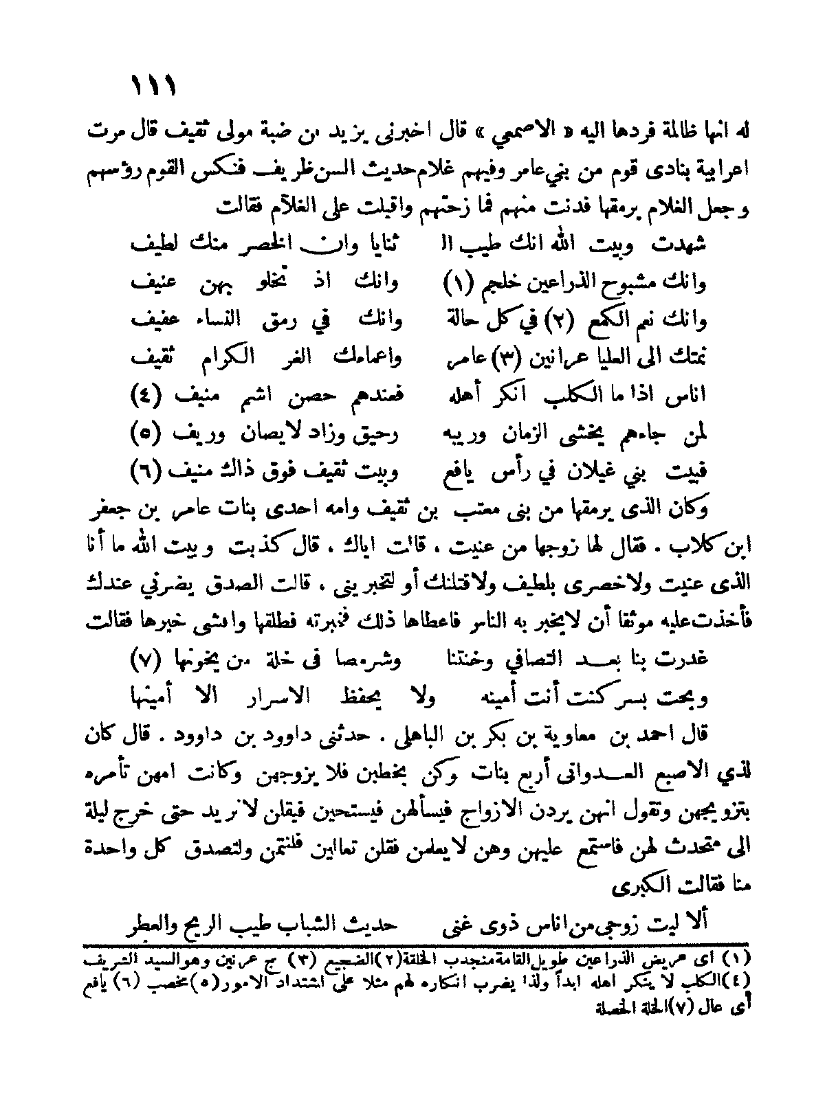 له أنها ظالمة فردها إليه " الأصمعي " قال أخبرني يزيد بن ضبة مولى ثقيف قال مرت أعرابية بنادي قومٍ من بني عامر وفيهم غلام حديث السن ظريف فنكس الكوم رؤوسهم وجعل الغلام يرمقها فدنت منهم فمازحتهم وأقبلت على الغلام فقالت: