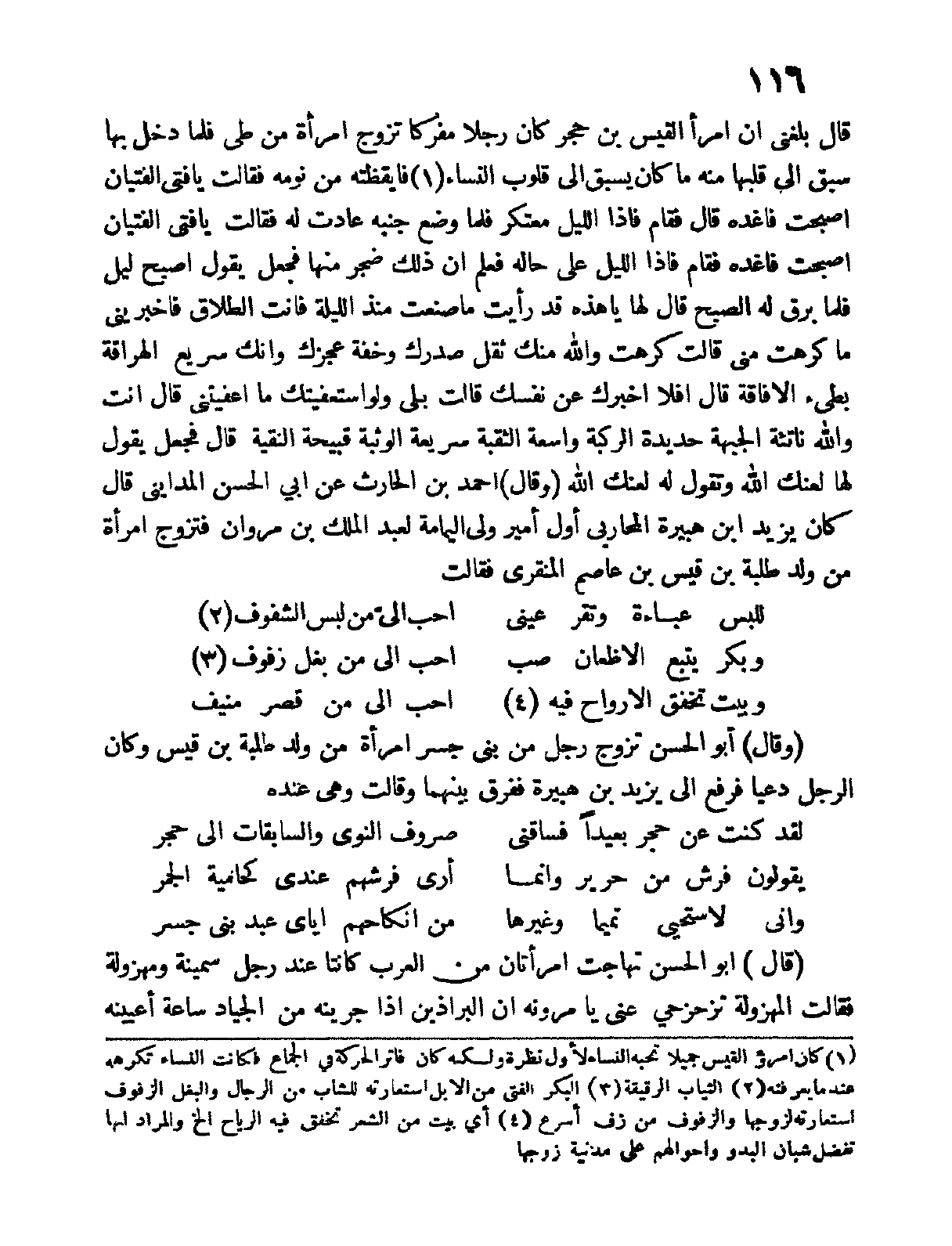 قال بلغني أن امرؤ القيس بن حجر كان رجلاً مفركاً تزوج من امرأة من طي فلما دخل بها سبق إلى قلبها منه ما كان يسبق إلى قلوب النساء فأيقظته من نومه فقالت يا فتى الفتيان أصبحت فاغدة قال فقام فإذا الليل معتكر فلما وضع جنبه عادت له فقالت يا فتى الفتيان أصبحت فاغدة فقام فإذا الليل على حاله فعلم أن ذلك ضجرٌ منها فجعل يقول أصبح ليلاً برق له الصبح قال لها يا هذه قد رأيت ما صنعت منذ الليلة فأنت الطلاق فأخبريني ما كرهت مني قالت والله منك ثقل صدرك وخفة عجزك وإنك سريع الهراقة بطيء الأفاقة قال أفلا أخبرك عن نفسك قالت بلى ولو استعفيتك ما أعفيتني قالت أنت والله ناتئة الجبهة حديدة الركبة واسعة الثقبة سريعة الوثبة قبيحة النقية قال فجعل يقول لها لعنك الله وتقول له لعنك الله " وقال " أحمد بن الحارث عن أبي الحسن المدايني قال كان يزيد بن هبيرة المحاربي أول أمير ولي اليمامة لعبد الملك بن مروان فتزوج امرأة من ولد طلبة بن قيس بن عاصم المنقري فقالت: