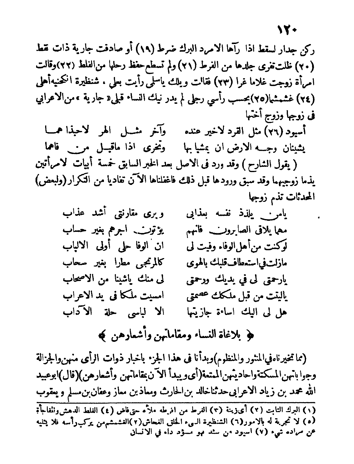 ومما تخيرناه في المنثور والمنظوم وبدأنا في هذا الجزء بأخبار ذوات الرأي منهن والجزالة وجواباتهن المسكتة وأحاديثهن الممتعة أي ويبدأ الآن مقاماتهن وأشعارهن قال أبو عبيد الله محمد بن زياد الإعرابي حدثنا خالد بن الحارث ومعاذ بن معاز وعفان بن مسلم ويعقوب
