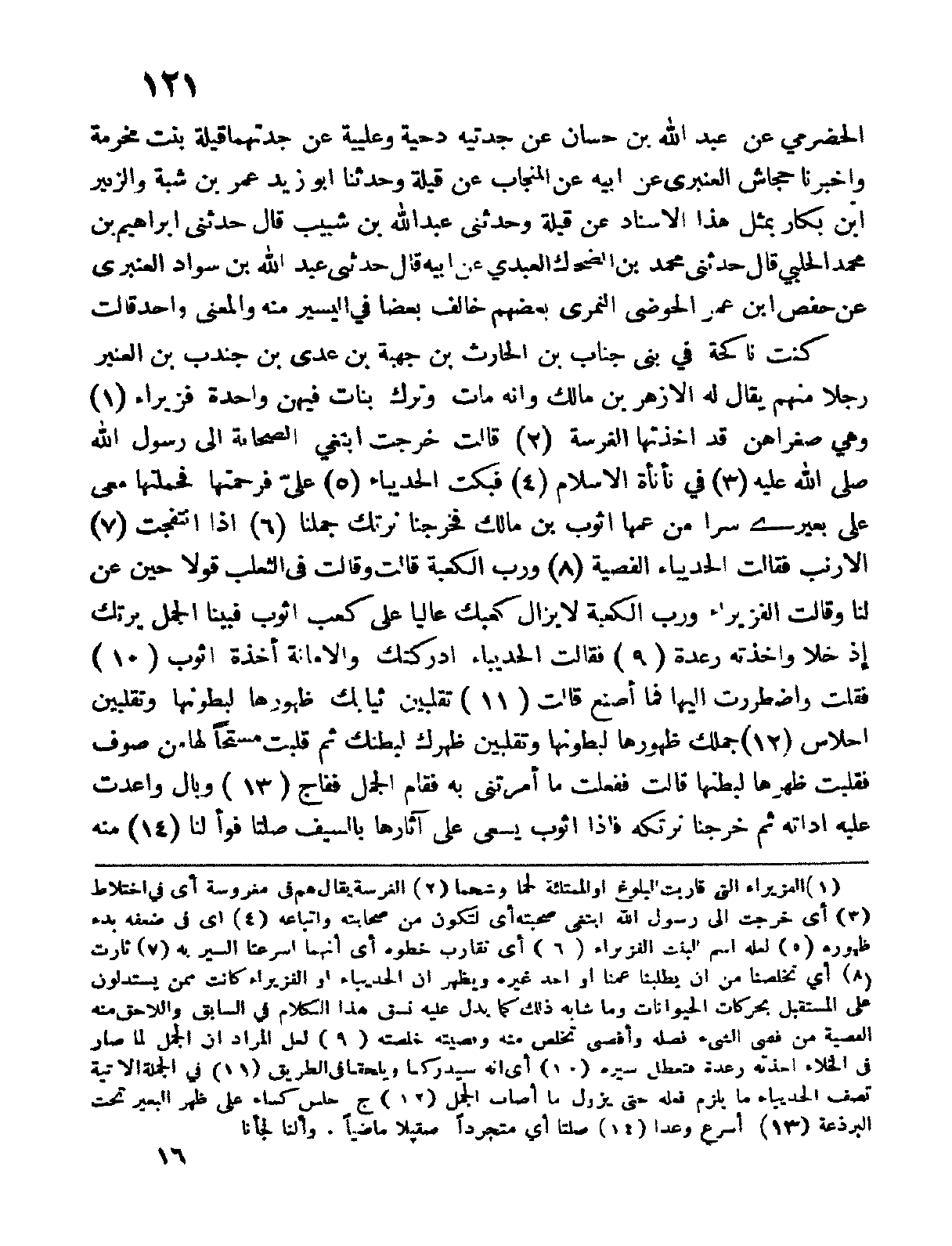 الحضرمي عن عبد الله بن حسان عن جدتيه دحية وعلية عن جدتهما قيلة بنت مخرمة وأخبرنا حجاش العنبري عن أبيه عن المنجاب عن قيلة وحدثنا أبو زيد عمر بن شبة والزبير بن بكار بمثل هذا الإسناد عن قيلة وحدثني عبد الله بن شبيب قال حدثني ابراهيم بن محمد الحلبي قال حدثني عبد الله بن سواد العنبري عن حفص بن عمر الحوضي النمري بعضهم خالف بعضاً في اليسير منه والمعنى واحد قالت: كنت ناكحة في بني جناب بن الحارث بن جهبة بن عدي بن جندب بن العنبر رجلاً منهم يقال له الأزهر بن مالك وأنه مات وترك بنات فيهن واحدة فزيراء وهي صغراهن قد أخذتها الغرسة قالت خرجت أبتغي الصحابة إلى رسول الله صلى الله عليه وسلم لى الله عليه واَله في نأنأة الاسلام فبكت الحديباء علي فرحمتها فحملتها معي على بعيري سراً من عمها أثوب بن مالك فخرجنا نرتك جملنا إذا انتفجت الأرنب فقالت الحديباء الفصية ورب الكعبة لا يزال كعبك عالياً على كعب أثوب فبينا الجمل يرتك إذ خلا وأخذته رعدة فقالت الحديباء أدركتك والأمانة أخذة أثوب فقلت واضطررت إليها فما اصنع قالت تقلبين ثيابك ظهورها لبطونها وتقلبين أحلاس جملك ظهورها لبطونها وتقلبين ظهرك لبطنك ثم قلبت مستحالها من صوف فقلبت ظهرها لبطنها قالت ففعلت ما أمرتني به فقام الجمل ففاج وبال واعدت عليه أدائه ثم خرجنا نرتكه فإذا أثوب يسعى على آثارها بالسيف صلتا فوألنا منه