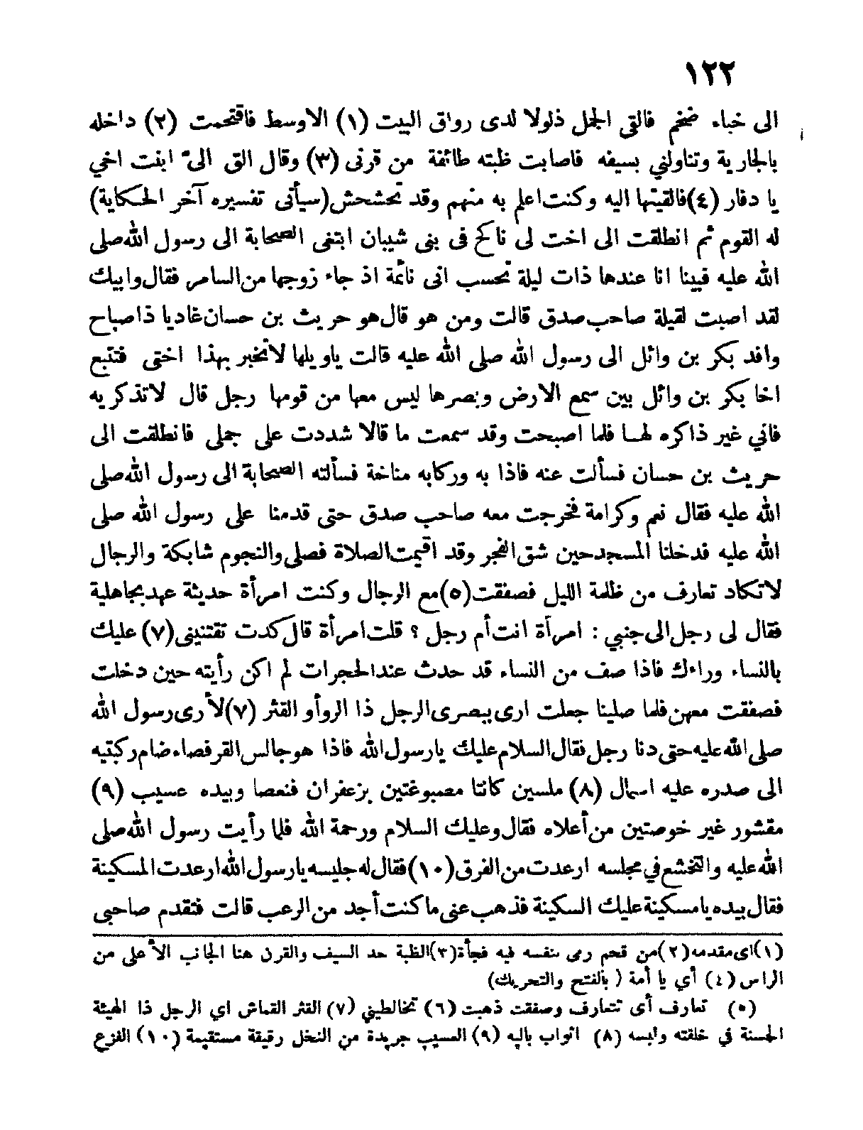 إلى خباء ضخم فألقى الجمل ذلولاً لدي رواق البيت الأوسط فاقتحمت داخله بالجارية وتناولني بسيفه فأصابت ظبته طائفة من قرني وقال الق إلي ابنة أخي يا دفار فألقيتها إليه وكنت أعلم به منهم وقد تحشحش سيأتي تفسيره آخر الحكاية له القوم ثم انطلقت إلى أخت لي ناكح في بني شيبان ابتغي الصحابة إلى رسول الله صلى الله عليه وسلم لى الله عليه فبينا أنا عندها ذات ليلة تحسب أني نائمة إذ جاء زوجها من السامر فقال: وأبيك لقد أصبت لقيلة صاحب صدق قالت ومن هو قال هو حريث بن حسان غادياً ذا صباح وافد بكر بن وائل إلى رسول الله صلى الله عليه وسلم لى الله عليه قالت يا ويلها لا تخبر بهذا أختي فتتبع أخا بكر بن وائل بين سمع الأرض وبصرها ليس معها من قومها رجل قال لا تذكريه فإني غير ذاكره لها فلما أصبحت وقد سمعت ما قال شددت على جملي فانطلقت الى حريث بن حسان فسألت عنه فإذا به وركابه مناخة فسألته الصحابة إلى رسول الله صلى الله عليه وسلم لى الله عليه فقال نعم وكرامة فخرجت معه صاحب صدق حتى قدمنا على رسول الله صلى الله عليه وسلم لى الله عليه واَله فدخلنا المسجد حين شق الفجر وقد أقيمت الصلاة فصلى والنجوم شابكة والرجال لا تكاد تعارف من ظلمة الليل فصففت مع الرجال وكنت امرأة حديثة عهد بجاهلية فقال لي رجل إلى جنبي امرأة أنت أم رجل؟ قلت امرأة قال كدت تقتنيني عليك بالنساء وراءك فإذا صف من النساء قد حدث عند الحجرات لم أكن رأيته حين دخلت فصففت معهن فلما صلينا جعلت أرى ببصري الرجل ذا الرو أو القثر لأرى رسول الله صلى الله عليه وسلم لى الله عليه حتى دنا رجل فقال السلام عليك يا رسول الله صلى الله عليه وسلم إذا هو جالس القرفصاء ضام ركبتيه إلى صدره عليه اسمال ملسين كانت مصبوغتين بزعفران فنعصا وبيده عسيب مقشور غير خوصتين من أعلاه فقال وعليك السلام ورحمة الله فلما رأيت رسول الله صلى الله عليه وسلم لى الله عليه واَله والتخشع في مجلسه أرعدت من الفرق فقال له جليسه يا رسول الله صلى الله عليه وسلم رعدت المسكينة فقال بيده يا مسكينة عليك السكينة فذهب عني ما كنت أجد من الرعب قالت: فتقدم صاحبي