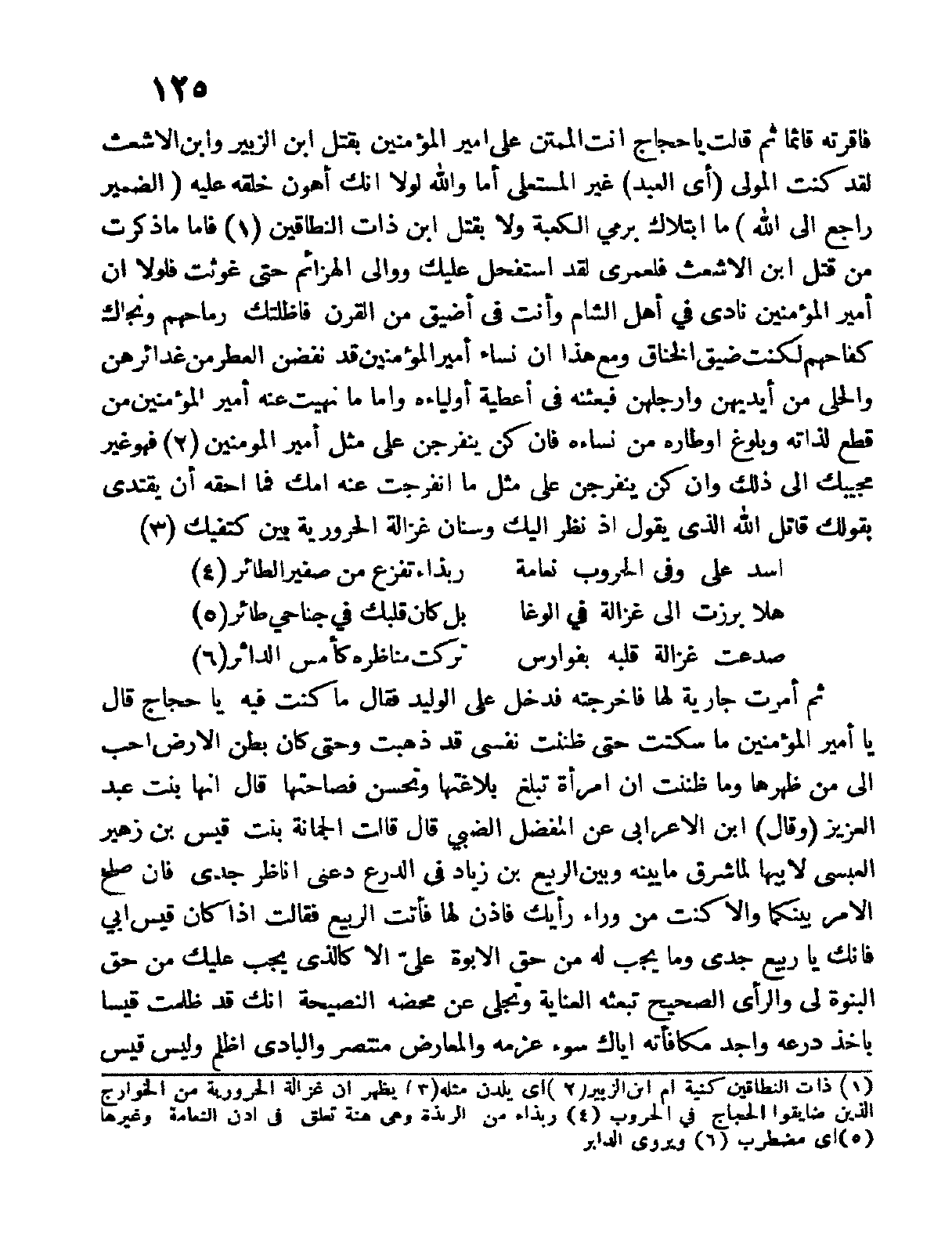 فأقرته قائماً ثم قالت يا حجاج أنت الممتن على أمير المؤمنين بقتل ابن الزبير وابن الأشعث لقد كنت المولى أي العبد غير المستعلي أما والله لولا أنك أهون خلقه عليه الضمير راجع إلى الله ما ابتلاك برمي الكعبة ولا بقتل ابن ذات النطاقين فأما ما ذكرت من قتل ابن الأشعث فلعمري لقد استفحل عليك ووالى الهزائم حتى غوثت فلولا أن أمير المؤمنين نادى في أهل الشام وأنت في أضيق من القرن فأظلنك رماحهم ونجاك كفاحهم لكنت ضيق الخناق ومع هذا إن نساء أمير المؤمنين قد نفضن العطر من غدائرهن والحلي من أيديهن وأرجلهن فبعثنه في أعطية أوليائه وأما ما نهيت عنه أمير المؤمنين من قطع لذاته وبلوغ أوطاره من نسائه فإن كن ينفرجن على مثل أمير المؤمنين فهو غير مجيبك إلى ذلك وان كن ينفرجن على مثل ما انفرجت عنه أمك فما أحقه أن يقتدي بقولك قاتل الله الذي يقول إذ نظر إليك وسنان غزالة الحرورية بين كتفيك: