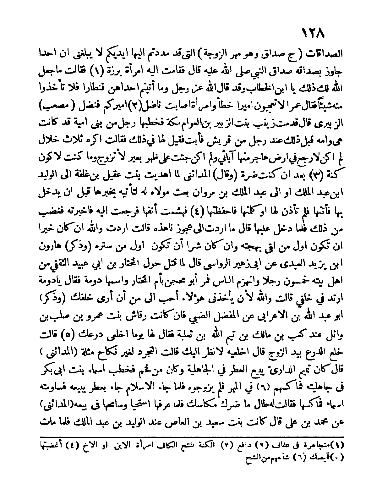 الصداقات جمع صداق ومهر الزوجة التي قد مددتم إليها أيديكم لا يبلغني أن أحداَ جاوز بصداقه صداقالنبي صلى الله عليه وسلم لى الله عليه قال فقامت اليه امرأة برزة فقالت ما جعل الله لك ذلك يابن الخطاب وقد قال الله عز وجل وإن أوتيتم احداهن قنطاراً فلا تأخذوا منه شيئاً فقال عمر إلا تعجبون أميراَ خطأ وامرأة أصابت ناضل أميركم فنضل مصعب الزبير قال قدمت زينب بنت الزبير بن العوام مكة فخطبها رجل من بني أمية قد كانت هي وأمه قبل ذلك عند رجل من قريش فأبت فقيل لها في ذلك فقالت أكره ثلاث خلال لم أكن لأرجع في أرض هاجر منها اَبائي ولم أكن جئت على ظهر بعير لأتزوج وما كنت لأكون كنة بعد أن كنت ضرة وقال المدائني لما أهديت بنت عقيل بن غلفة إلى الوليد بن عبد الملك بن مروان بعث مولاه له لتأتيه بخبرها قبل أن يدخل بها فأتتها فلم تأذن لها أو كلمتها فأحفظتها فهشمت انفها فرجعت اليه فأخبرته فغضب من ذلك فلما دخل عليها قال ما أردت إلى عجوزنا هذه قالت اردت والله ان كان خيراً أن تكون أول من لقى بهجته وان كان شراً أن تكون أول من ستره وذكر هارون بن يزيد العبدي عن أبي زهير الرواسي قال لما قتل حول المختار بن أبي عبيد الثقفي من اهل بيته خمسون رجلاً وانهزم الناس فمر أبو محجن بأم المختار واسمها دومة فقال يا دومة ارتدي خلفي قالت والله لإن يأخذني هؤلاء أحب الي من أن أرتدى خلفك وذكر أبو عبد الله بن الأعرابي عن المفضل الضبي قال كانت رقاش بنت عمرو بن صلب بن وائل عند كعب بن مالك بن تيم الله بن ثعلبة فقال لها يوماً اخلعي درعك قالت خلع الدرع بيد الزوج قال اخلعيه لأنظر إليك قالت التجرد لغير نكاح مثله المدائني قال كان تميم الداري يبيع العطر في الجاهلية وكان من لخم فخطب أسماء بنت أبي بكر في جاهليته فماكسهم في المهر فلم يزوجوه فلما جاء الإسلام جاء بعطر يبيعه فساومته اسماء فماكسها فقالت طال ما ضرك مكاسك فلما عرفها استحى وسامحها في بيعه المدائني عن محمد بن علي قال كانت بنت سعيد بن العاص عند الوليد بن عبد الملك فلما مات