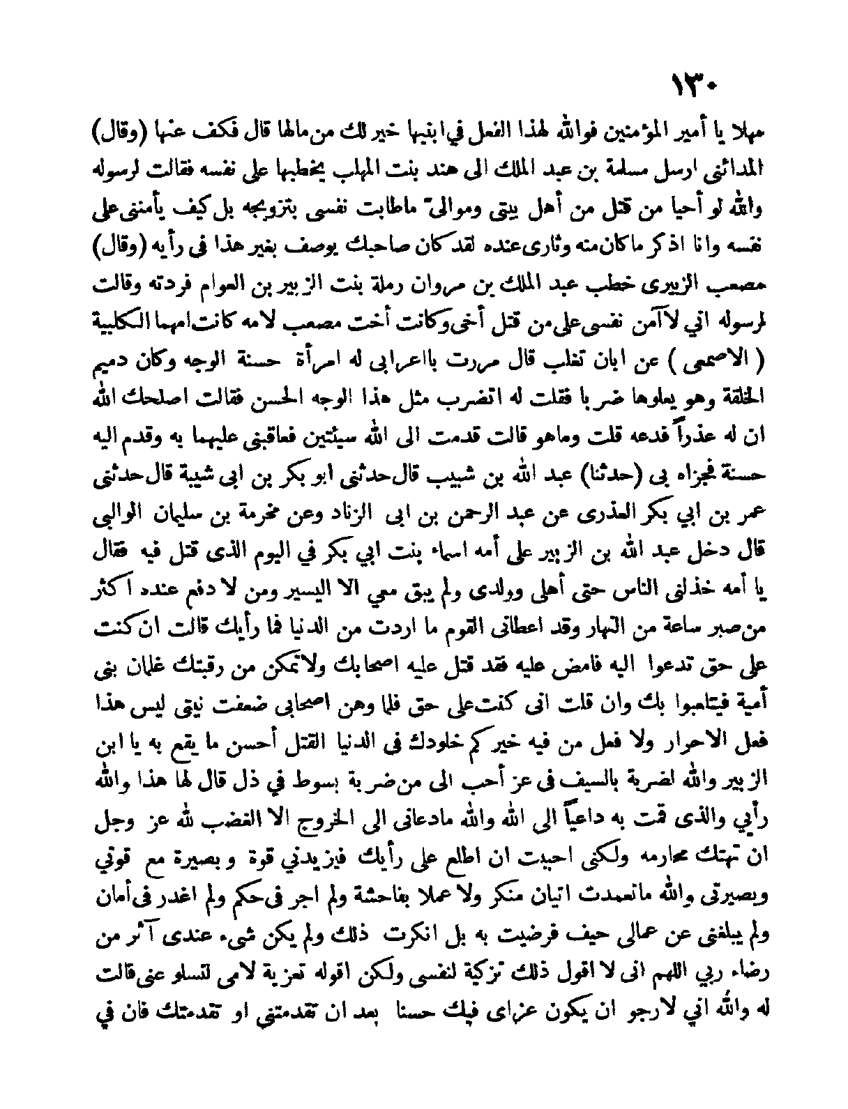 مهلاً يا أمير المؤمنين فوالله لهذا الفعل في ابنيها خير لك من مالها قال فكف عنها وقال المدائني أرسل مسلمة بن عبد الملك إلى هند بنت المهلب يخطبها على نفسه فقالت لرسوله والله لو أحيا من قتل من أهل بيتي وموالي ما طابت نفسي بتزويجه بل كيف يأمنني على نفسه وأنا أذكر ما كان منه وثاري عنده لقد كان صاحبك يوصف بغير هذا في رأيه وقال مصعب الزبيري خطب عبد الملك بن مروان رملة بنت الزبير بن العوام فردته وقالت لرسوله إني لا اَمن نفسي على من قتل أخي وكانت أخت مصعب لأمه كانت امهما الكلبية الأصمعي عن أبان بن تغلب قال مررت بإعرابي له امرأة حسنة الوجه وكان دميم الخلقة وهو يعلوها ضرباً فقلت له أتضرب مثل هذا الوجه الحسن فقالت أصلحك الله ان له عذراً فدعه قلت وما هو قالت قدمت إلى الله سيئتين فعاقبني عليهما به وقدم اليه حسنة فجزاه بي حدثنا عبد الله ابن شبيب قال حدثني أبو بكر بن أبي شيبة قال حدثني عمر بن أبي بكر العذري عن عبد الرحمن بن أبي الزناد وعن مخرمة بن سليمان الوالبي قال دخل عبد الله بن الزبير على أمه أسماء بنت أبي بكر في اليوم الذي قتل فيه فقال يا أمه خذلني الناس حتى أهلي وولدي ولم يبق معي إلا اليسير ومن لا دفع عنده أكثر من صبر ساعة من النهار وقد أعطاني القوم ما أردت من الدنيا فما رأيك قالت إن كنت على حق تدعو إليه فامض عليه فقد قتل عليه أصحابك ولا تمكن من رقبتك غلمان بني أمية فيتلعبوا بك وإن قلت اني كنت على حق فلما وهن أصحابي ضعفت نيتي ليس هذا فعل الأحرار ولا فعل من فيه خيركم خلودك في الدنيا القتل أحسن ما يقع به يا ابن الزبير والله لضربة بالسيف في عز أحب إلي من ضربة بسوط في ذل قال لها هذا والله رأيي والذي قمت به داعياً إلى الله والله ما دعاني إلى الخروج إلا الغضب لله عز وجل أن تهتك محارمه ولكني أحببت أن أطلع على رأيك فيزيدني قوة وبصيرة مع قوتي وبصريتي والله ما تعمدت إتيان منكر ولا عملاً بفاحشة ولم أجر في حكم ولم أغدر في أمان ولم يبلغني عن عمالي حيف فرضيت به بل أنكرت ذلك ولم يكن شيء عندي اَثر من رضاء ربي اللهم اني لا أقول ذلك تزكية لنفسي ولكن اقوله تعزية لأمي لتسلو عني قالت له والله اني لأرجو ان يكون عزاي فيك حسناً بعد ان تقدمتني أو تقدمتك فان في
