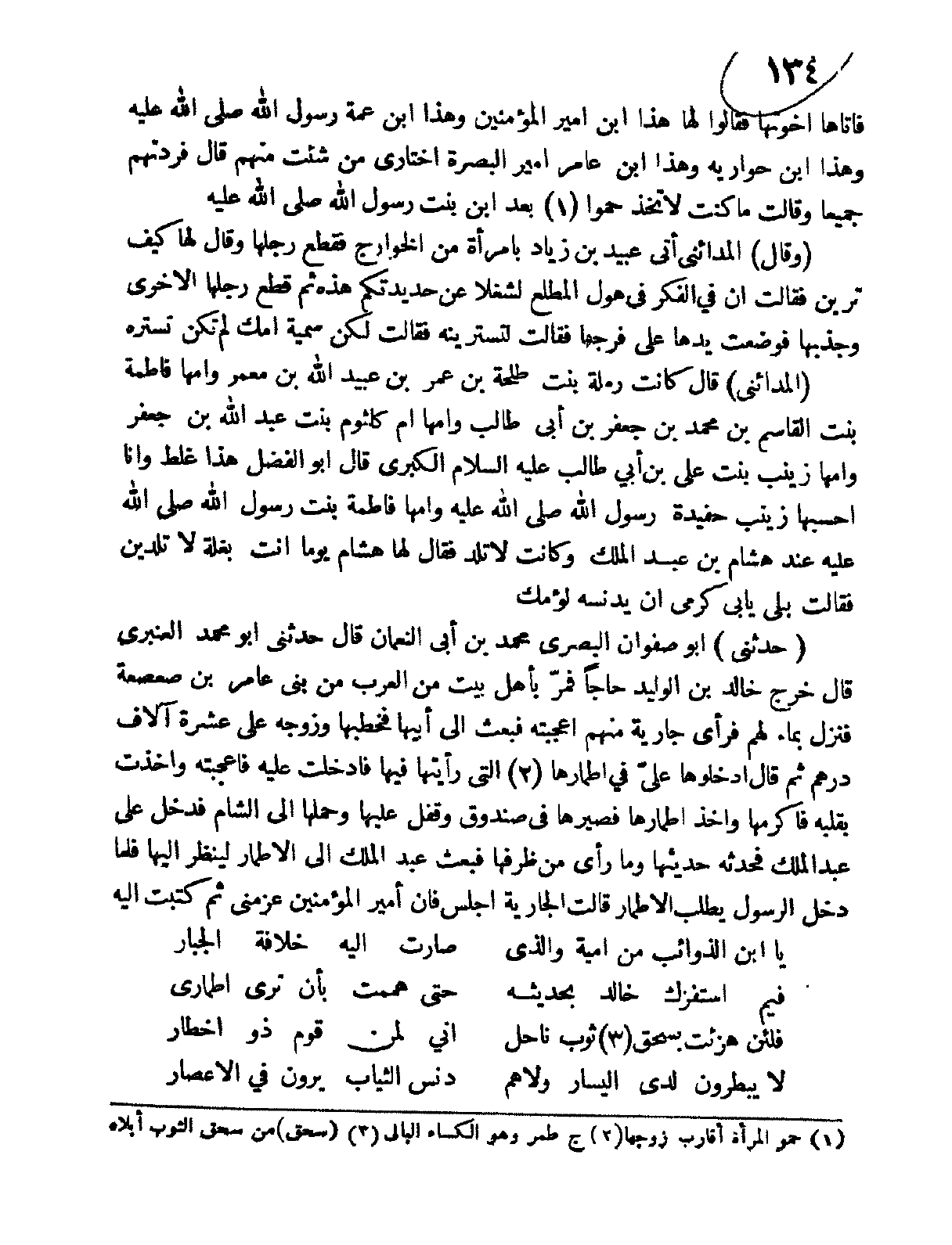 المدائني قال كانت رملة بنت طلحة بن عمر بن عبيد الله بن معمر وأمها فاطمة بنت القاسم بن محمد بن جعفر بن أبي طالب وأمها أم كلثوم بنت عبد الله بن جعفر وأمها زينب بنت علي بن أبي طالب عليه السلام الكبرى قال أبو الفضل هذا غلط وأنا أحسبها زينب حفيدة رسول الله صلى الله عليه وسلم لى الله عليه وأمها فاطمة بنت رسول الله صلى الله عليه وسلم لى الله عليه عند هشام بن عبد الملك وكانت لا تلد فقال لها هشام يوماً أنت بعلة لا تلدين فقالت بلى يأبى كرمي أن يدنسه لؤمك.