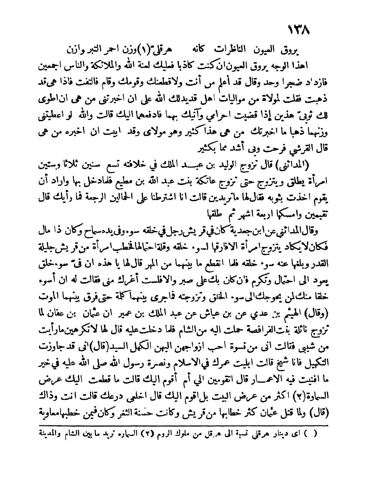 المدائني قال تزوج الوليد بن عبد الملك في خلافته تسع سنين ثلاثاً وستين امرأة يطلق ويتزوج حتى تزوج عاتكة بنت عبد الله بن مطيع فلما دخل بها وأراد أن يقوم أخذت بثوبه فقال لها ما تريدين قالت انا اشترطنا على الحمالين الرجعة فما رأيك قال تقيمين وأمسكها أربعة أشهر ثم طلقها.