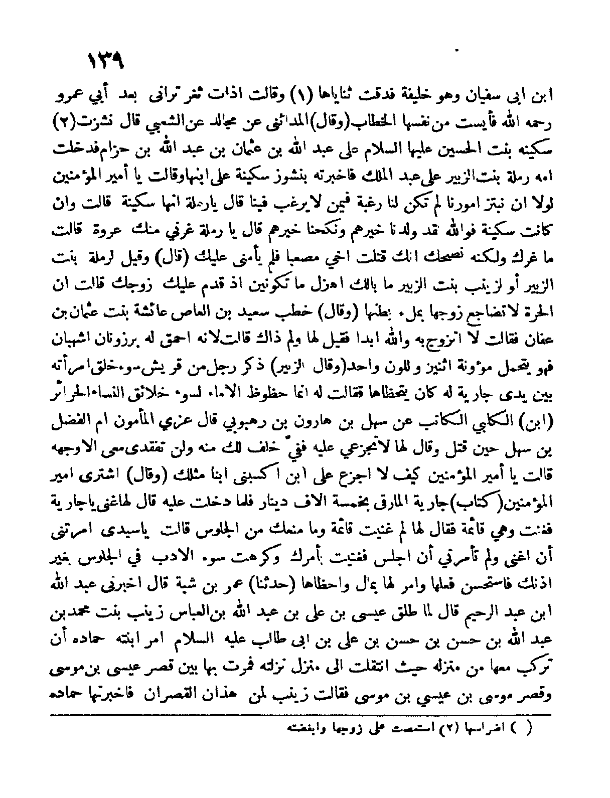 حدثنا عمر بن شبة قال أخبرني عبد الله بن عبد الرحيم قال لما طلق عيسى بن علي بن عبد الله بن العباس زينب بنت محمد بن عبد الله بن الحسن بن الحسن بن علي بن أبي طالب عليه السلام أمر ابنته حمادة أن تركب معها من منزله حيث انتقلت إلى منزل نزلته فمرت بها بين قصر عيس بن موسى وقصر موسى بن عيسى بن موسى فقالت زينب لمن هذان القصران فأخبرتها حمادة