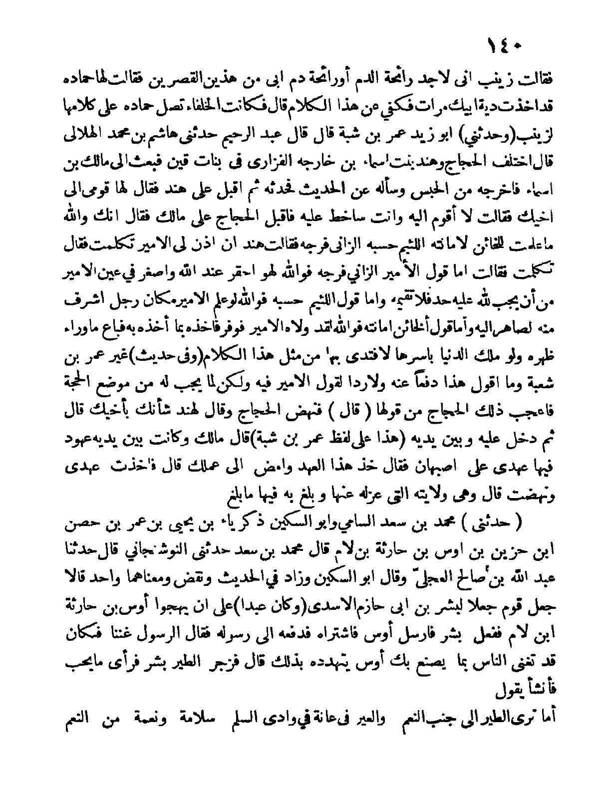 وحدثني أبو زيد عمر بن شبة قال قال عبد الرحيم حدثني هاشم بن محمد الهلالي قال اختلف الحجاج وهند بنت أسماء بن خارجة الفزاري في بنات قين فبعث إلى مالك بن أسماء فأخرجه من الحبس وسأله عن الحديث فحدثه ثم أقبل على هند فقال لها قومي إلى أخيك فقالت لا أقوم اليه وأنت ساخط عليه فأقبل الحجاج على مالك فقال انك والله ما علمت للخائن لأمانته اللئيم حسبه الزاني فرجه فقالت هند ان أذن لي الأمير تكلمي فقال تكلمت فقالت أما قول الأمير الزاني فرجه فوالله لهو أحقر عند الله وأصغر في عين الأمير من أن يجب لله عليه حد فلا تقيمه أما قول اللئيم حسبه فوالله لو علم الأمير مكان رجل أشرف منه لصاهر اليه وأما قول الخائن أمانته فوالله لقد ولاه الأمير فوفر فأخذه بما أخذه به فباع ما وراء ظهره ولو ملك الدنيا بأسرها لأفتدى بها من مثل هذا الكلام وفي حديث غير عمر بن شعبة وما أقول هذا دفعاً عنه ولا رد القول الأمير فيه ولكن لما يجب له من موضع الحجة فأعجب ذلك الحجاج من قولها قال فنهض الحجاج وقال لهند شأنك بأخيك قال ثم دخل عليه وبين يديه هذا على لفظ عمر بن شبة قال مالك وكانت بين يديه عهود فيها عهدي على أصبهان فقال خذ هذا العهد وامض إلى عملك ونهضت قال وهي ولايته التي عزله عنها وبلغ به فيها ما بلغ.