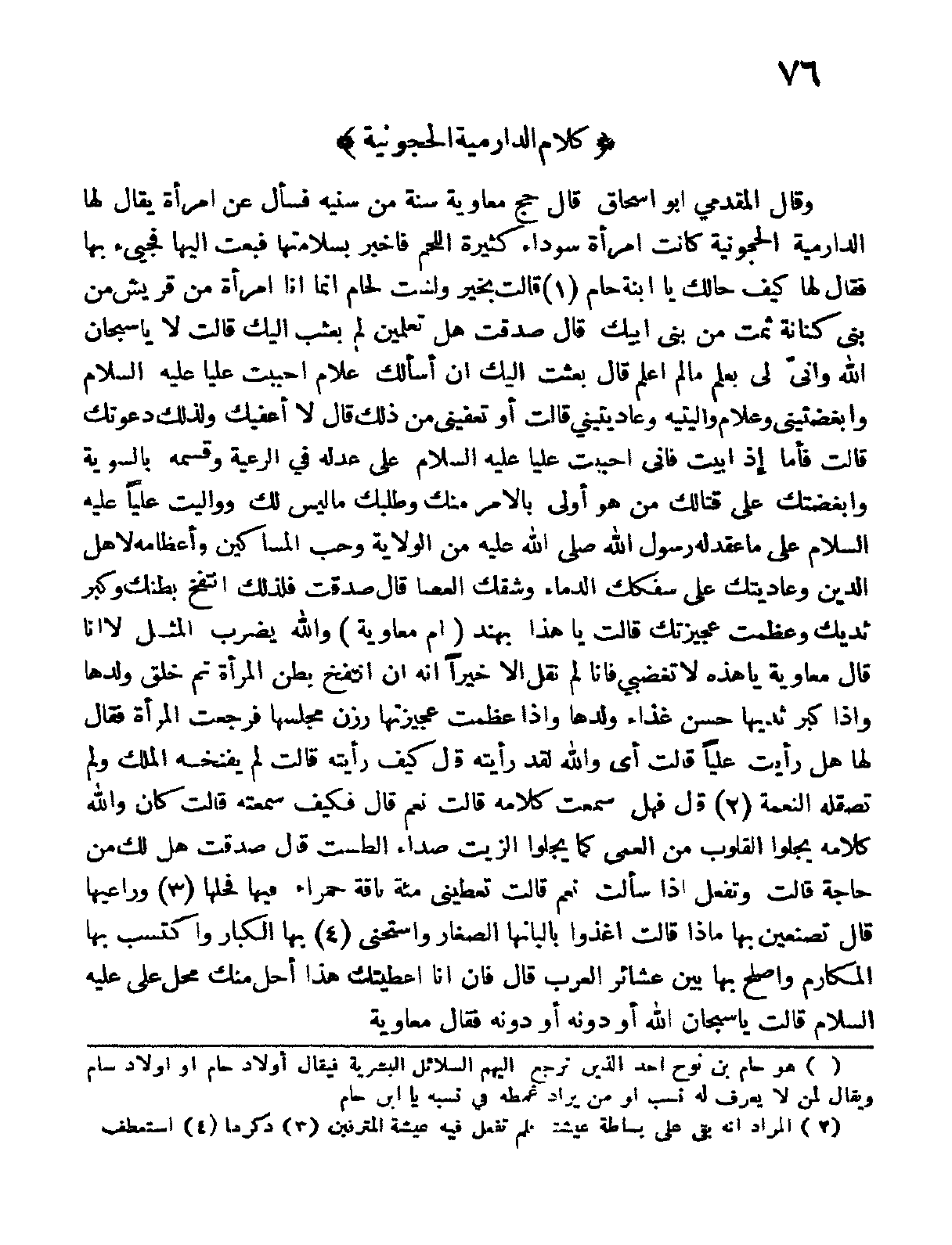 وقال المقدمي أبو إسحاق قال حج معاوية سنة من سنيه فسأل عن امرأة يقال لها الدارمية الحجونية كانت امرأة سوداء كثيرة اللحم فاخبر بسلامتها فبعث إليها فجيء بها فقال لها كيف حالك يا ابنة حام قالت بخير ولست لحام إنما أنا امرأة من قريش من بني كنانة ثمت من بني أبيك قال صدقت هل تعلمين لم بعثت إليك قالت لا يا سبحان الله وأنى لي بعلم ما لم أعلم قال بعثت إليك أن أسألك علام أحببت علياً عليه السلام وأبغضتيني وعلام واليتيه وعاديتيني قالت أو تعفيني من ذلك قال لا أعفيك ولذلك دعوتك قالت فأما إذا أبيت فإني أحببت علياً عليه السلام على عدله في الرعية وقسمه بالسوية وأبغضتك على قتالك من هو أولى بالأمر منك وطلبك ما ليس لك وواليت علياً عليه السلام على ما عقد له رسول الله صلى الله عليه وسلم لى الله عليه من الولاية وحب المساكين وأعظامه لأهل الدين وعاديتك على سفكك الدماء شقك العصا قال صدقت فلذلك انتفخ بطنك وكبر ثديك وعظمت عجيزتك قالت يا هذا بهند " أم معاوية " والله يضرب المثل لا أنا قال معاوية يا هذه لا تغضبي فإنا لم نقل إلا خيراً انه إن انتفخ بطن المرأة ثم خلق ولدها وإذا كبر ثديها حسن غذاء ولدها وإذا عظمت عجيزتها رزن مجلسها فرجعت المرأة فقال لها هل رأيت علياً قالت أي والله لقد رأيته قال كيف رأيته قالت لم ينفخه الملك ولم تصقله النعمة قال فهل سمعت كلامه قالت نعم قال فكيف سمعته قالت كان والله كلامه يجلو القلب من العمى كما يجلو الزيت صداء الطست قال صدقت هل لك من حاجة قالت وتفعل إذا سألت قال نعم قالت تعطيني مائة ناقة حمراء فيها فحلها وراعيها قال ماذا تصنعين بها قالت اغذو بألبانها الصغار واستحني بها الكبار واكتسب بها المكارم وأصلح بها بين عشائر العرب قال فان أنا أعطيتك هذا أحل منك محل علي عليه السلام قالت يا سبحان الله أو دونه أو دونه فقال معاوية: