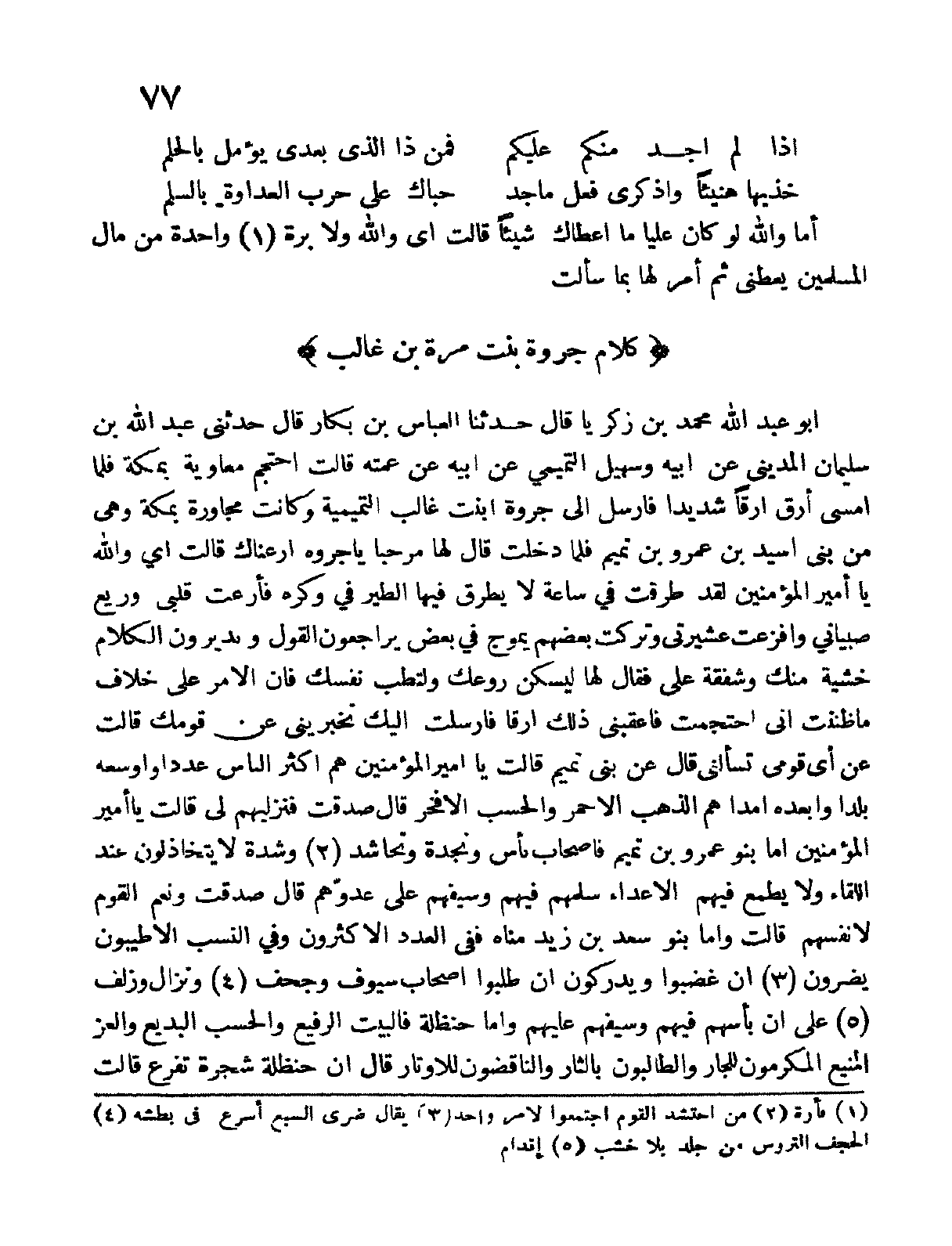 أبو عبد الله محمد بن زكريا قال حدثنا العباس بن بكار قال حدثني عبد الله بن سليمان المديني عن أبيه وسهيل التميمي عن أبيه عن عمته قالت احتجم معاوية بمكة فلما أمسى أرق أرقاً شديداً فأرسل إلى جروة ابنة غالب التميمية وكانت مجاورة بمكة وهي من بني أسيد بن عمرو بن تميم فلما دخلت قال لها مرحباً يا جروة أرعناك قالت أي والله يا أمير المؤمنين لقد طرقت في ساعةٍ لا يطرق فيها الطير في وكره فأرعت قلبي وريع صبياني وأفزعت عشيرتي وتركت بعضهم يموج في بعض يراجعون القول ويديرون الكلام خشية منك وشفقة فقال لها ليسكن روعك ولتطب نفسك فإن الأمر على خلاف ما ظننت أني احتجمت فأعقبني ذلك أرقاً فأرسلت إليك تخبريني عن قومك قالت عن أي قومي تسألني قال عن بني تميم قالت: يا أمير المؤمنين هم أكثر الناس عدداً وأوسعه بلداً وأبعده أمداً هم الذهب الأحمر والحسب الأفخر قال صدقت فنزليهم لي قال يا أمير المؤمنين أما بنو عمرو بن تميم فأصحاب بأسٍ ونجدة وتحاشد وشدة لا يتخاذلون عند اللقاء ولا يطمع فيهم الأعداء سلمهم فيهم وسيفهم على عدوهم قال صدقت ونعم القول لأنفسهم قالت وأما بنو سعد بن زيد مناه ففي العدد الأكثرون وفي النسب الأطيبون يضرون إن غضبوا ويدركون إن طلبوا أصحاب سيوف وجحف ونزال وزلف على أن بأسهم فيهم وسيفهم عليهم وأما حنظلة فالبيت الرفيع البديع والعز المنيع المكرومون للجار والطالبون بالثأر والناقضون للأوتار قال إن حنظلة شجرة تفرع قالت