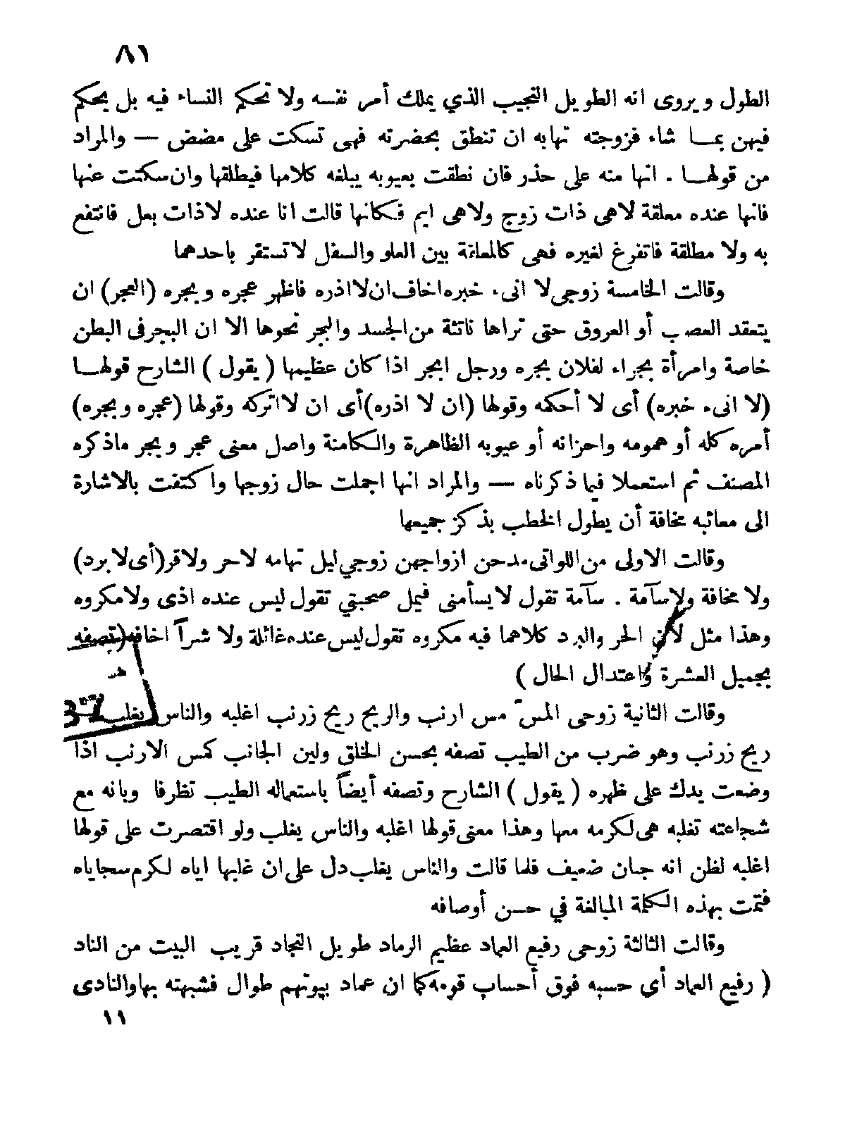 وقالت الخامسة زوجي لا أنيء خبره أخاف أن لا أذره فأظهر عجره وبجره " العجر " أن يتعقد العصب أو العروق حتى تراها ناتئة من الجسد والبجر نحوها إلا أن البجر في البطن خاصة وامرأة بجراء لفلان بجره ورجل أبجر إذا كان عظيمها " يقول الشارح " قولها " لا أنيء خبره " أي لا أحكمه وقولها أن لا أذره أي لا أتركه وقولها عجره وبجره أمره كله أو همومه وأحزانه أو عيوبه الظاهرة والكامنة وأصل معنى عجر وبجر ما ذكره المصنف ثم استعملا فيما ذكرناه والمراد أنها أجملت حال زوجها واكتفت بالإشارة إلى معائبه مخافة أن يطول الخطب بذكر جميعها.