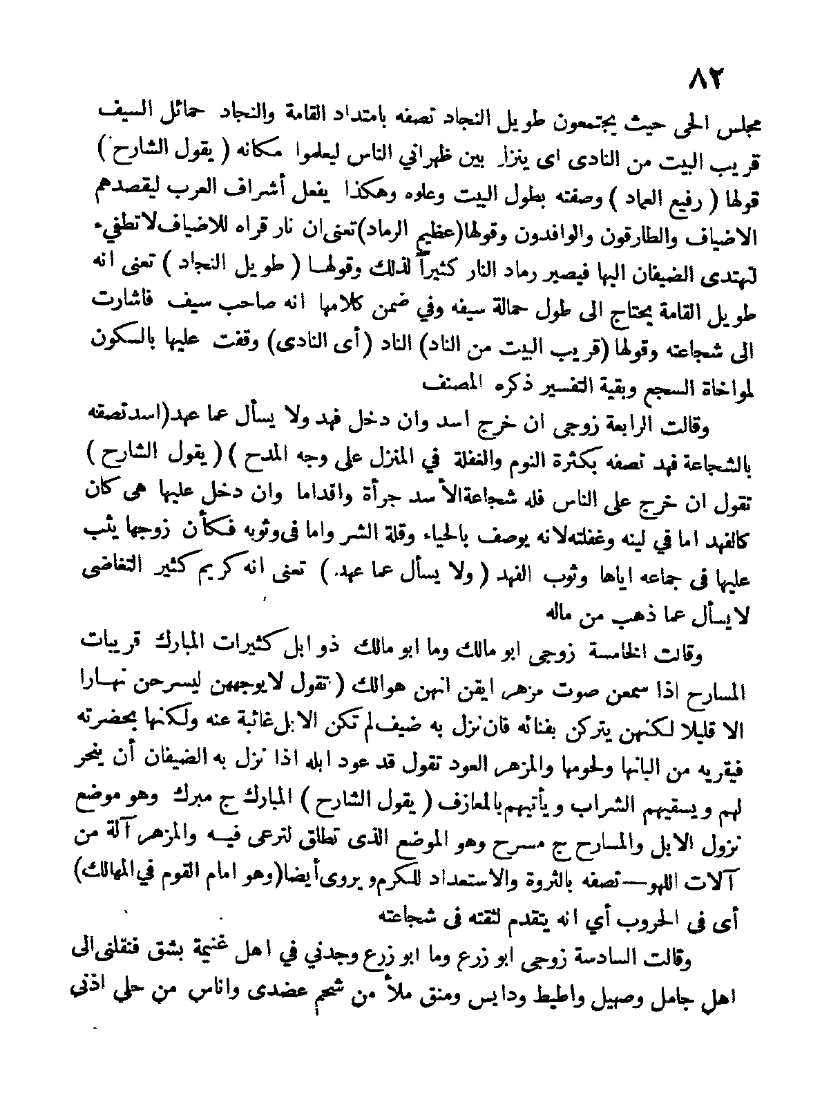 مجلس الحي حيث يجتمعون طويل النجاد تصفه بامتداد القامة والنجاد حمائل السيف قريب البيت من النادي أي ينزل بين ظهراني الناس ليعلموا مكانه " يقول الشارح " قولها " رفيع العماد " وصفته بطول البيت وعلوه وهكذا يفعل أشراف العرب ليقصدهم الأضياف والطارقون والوافدون وقولها " عظيم الرماد " تعني أن نار قراه للأضياف لا تطفىء لتهتدي الضيفان إليها فيصير رماد النار كثيراً لذلك وقولها " طويل النجاد " تعني أنه طويل القامة يحتاج إلى طول حمالة سيفه وفي ضمن كلامها أنه صاحب سيف فأشارت إلى شجاعته وقولها " قريب البيت من الناد " الناد " أي النادي " وقفت عليها بالسكون لمواخاة السجع وبقية التفسير ذكره المصنف.