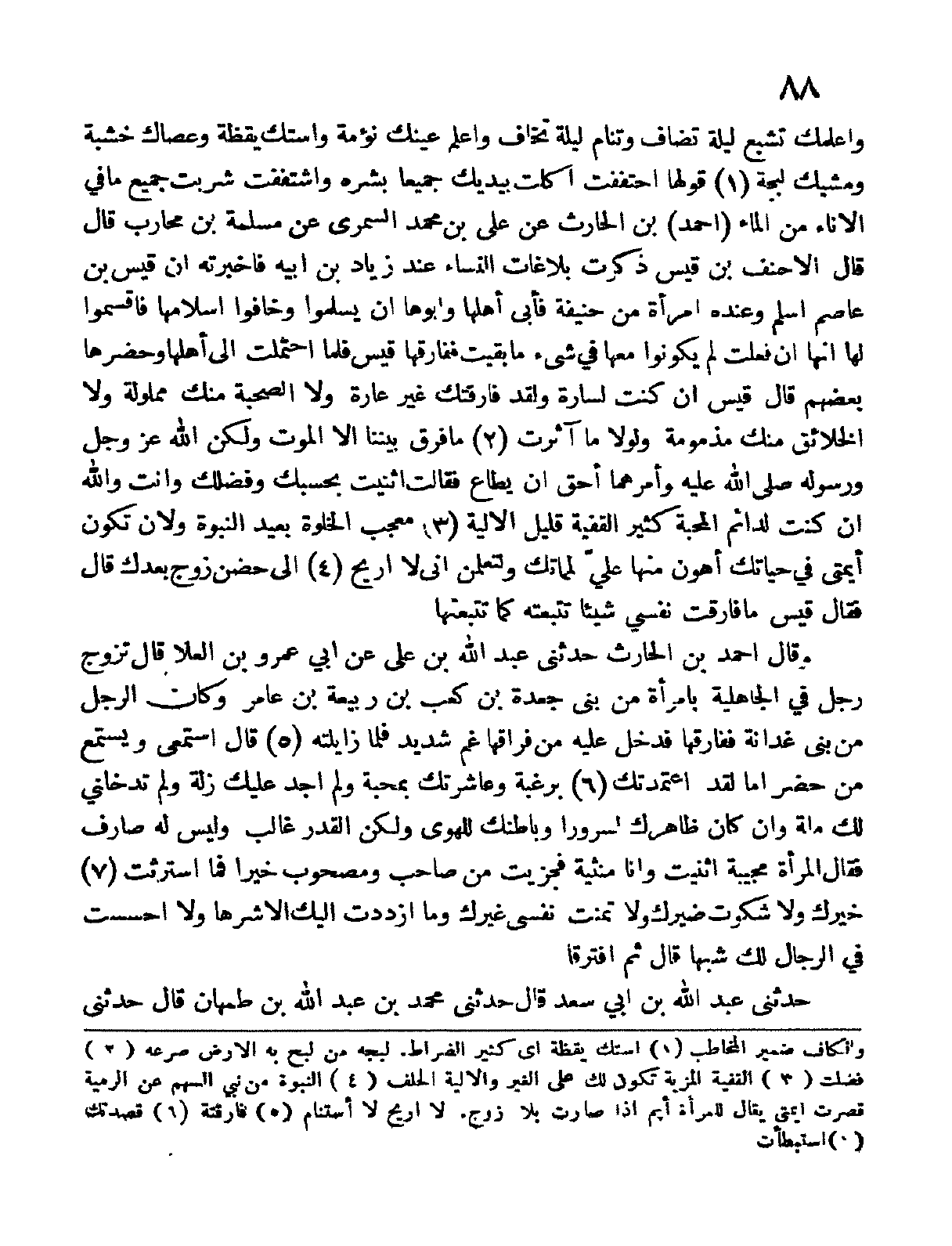 وأعلمك تشبع ليلة تضاف وتنام ليلة تخاف واعلم عينك نؤمة واستك يقظة وعصاك خشبة ومشيك لبجه قولها احتففت أكلت بيديك جميعاً بشره واشتففت شربت جميع ما في الإناء من الماء " أحمد " بن الحارث عن علي بن محمد السمري عن مسلمة بن محارب قال قال الأحنف بن قيس ذكرت بلاغات النساء عند زياد بن أبيه فأخبرته أن قيس بن عاصم أسلم وعنده امرأة من حنيفة فأبى أهلها وأبوها أن يسلموا وخافوا إسلامها فأقسموا لها إن فعلت لم يكونوا معها في شيء ما بقيت ففارقها قيس فلما احتملت إلى أهلها وحضرها بعضهم قال قيس إن كنت لسلوة ولقد فارقتك غير عارة ولا الصحبة منك مملولة ولا الخلائق منك مذمومة ولولا ما آثرت ما فرق بيننا إلا الموت ولكن الله عز وجل ورسوله صلى الله عليه وسلم وأمرهما أحق أن يطاع فقالت أثنيت بحسبك وفضلك وأنت والله ان كنت لدائم المحبة كثير القفية قليل الالية معجب الخلوة بعيد النبوة ولأن تكون أيمتي في حياتك أهون منها علي لمماتك ولتعلمن أني لا أريح إلى حضن زوجٍ بعدك قال فقال قيس ما فارقت نفسي شيئاً تتبعه كما تتبعتها.