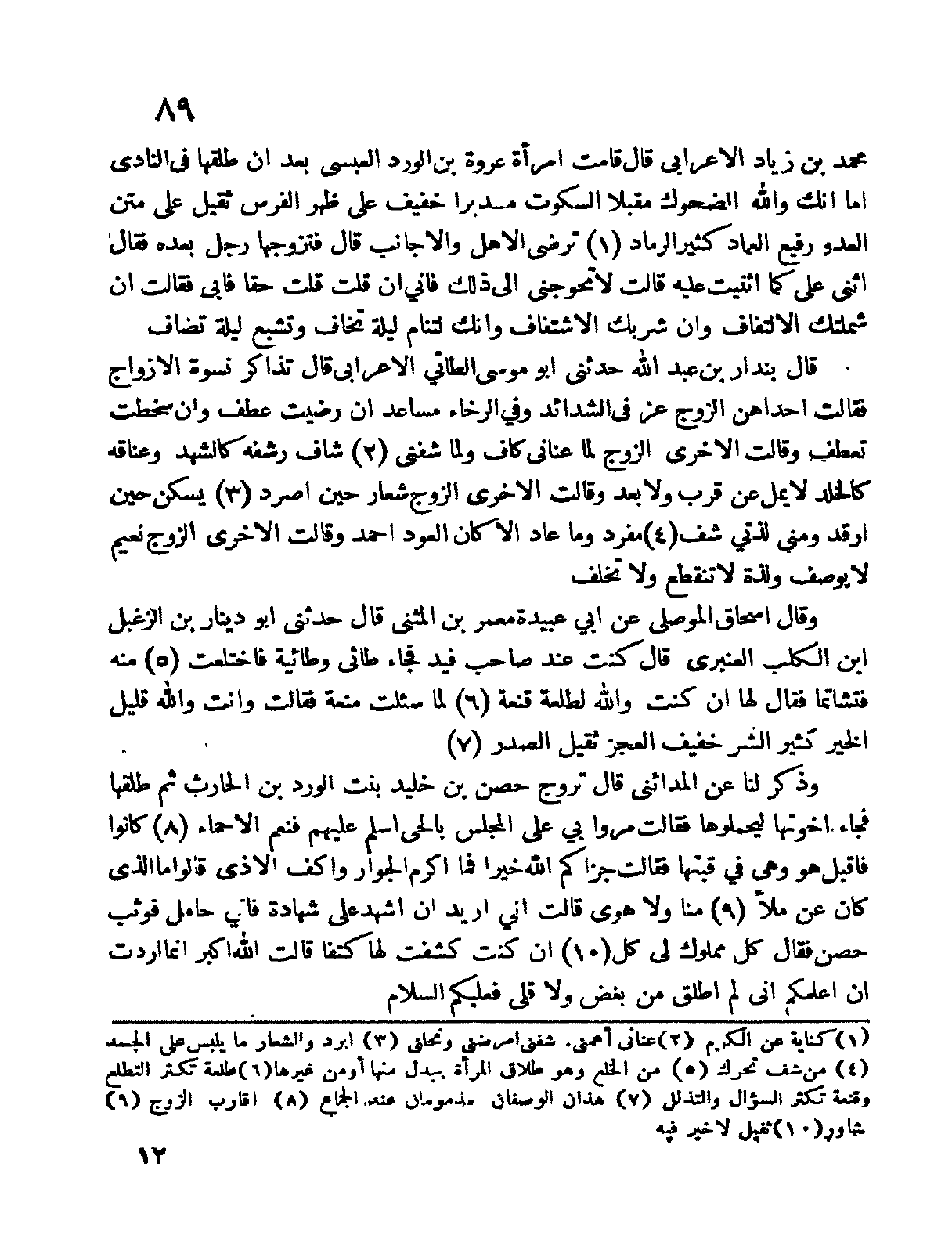 محمد بن زياد الأعرابي قال قامت امرأة عروة بن الورد العبسي بعد أن طلقها في النادي أما أنك والله الضحوك مقبلاً السكوت مدبراً خفيف على ظهر الفرس ثقيل على متن العدو رفيع العماد كثير الرماد ترضى الأهل والأجانب قال فتزوجها رجل بعده فقال إثني عليّ كما أثنيت عليه قالت لا تحوجني إلى ذلك فإني إن قلت قلت حقاً فأبى فقالت أن شملتك الالتفاف وإن شربك الاشتفاف وإنك لتنام ليلة تخاف وتشبع ليلة تضاف.
