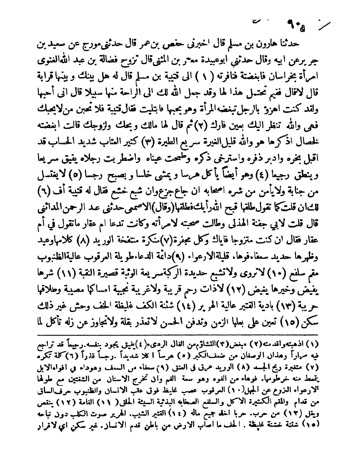 حدثنا هرون بن مسلم قال أخبرني حفص بن عمر قال حدثني مورج عن سعيد بن جرير عن أبيه وقال حدثني أبو عبيدة معمر بن المثنى قال تزوج فضالة بن عبد الله الغنوي امرأة بخراسان فأبغضته فنافرته إلى قتيبة بن مسلم قال له هل بينك وبينها قرابة قال لا قال ففيم تحتمل هذا لها وقد جعل الله لك إلى الراحة منها سبيلاً قال إني أحبها ولقد كنت أهزأ بالرجل تبغضه المرأة وهو يحبها فابتليت فقال قتيبة فلا تحبن من لا يحبك فهي والله تنظر إليك بعين فارك ثم قال لها مالك ويحك ولزوجك قالت أبغضته لخصال أذكرها هو والله قليل الغيرة سريع الطيرة كثير العتاب شديد الحساب قد أقبل بخره وأدبر ذفره واسترخى ذكره وطمحت عيناه واضطربت رجلاه يفيق سريعاً وينطق رجيعاً وهو أيضاً يأكل هرساً ويمشي خلساً ويصبح رجساً لا يغتسل من جنابة ولا يأمن من شره أصحابه إن جاع جزع وإن شبع خشع فقال له قتيبة أفٍ لك أن قلت كما تقول طلقها قبح الله رأيك فطلقها " وقال " الأصمعي حدثني عبد الرحمن المدائني قال قلت لأبي جفنة الهذلي وطالت صحبته لامرأته وكانت تدعى أم عقار ما تقول في أم عقار فقال إن كنت متزوجاً فإياك وكل مجفرة منكرة منتفخة الوريد كلامها وعيد وظهرها حديد سعفاء فوهاء قليلة الارعواء دائمة الدعاء طويلة العرقوب عالية الظنبوب مقم سلفع لا تروى ولا تشبع حديدة الركبة سريعة الوثبة قصيرة النقبة شرها يفيض وخيرها يغيض لا ذات رحم قريبة ولا غريبة نجيبة إمساكها مصيبة وطلاقها حريبة بادية القتير عالية الهرير شثنة الكف غليظة الخف وحش غير ذلك سكن تعين على بعلها الزمن وتدفن الحسن لا تعذر بقلة ولا تجاز عن زلة تأكل لمّا