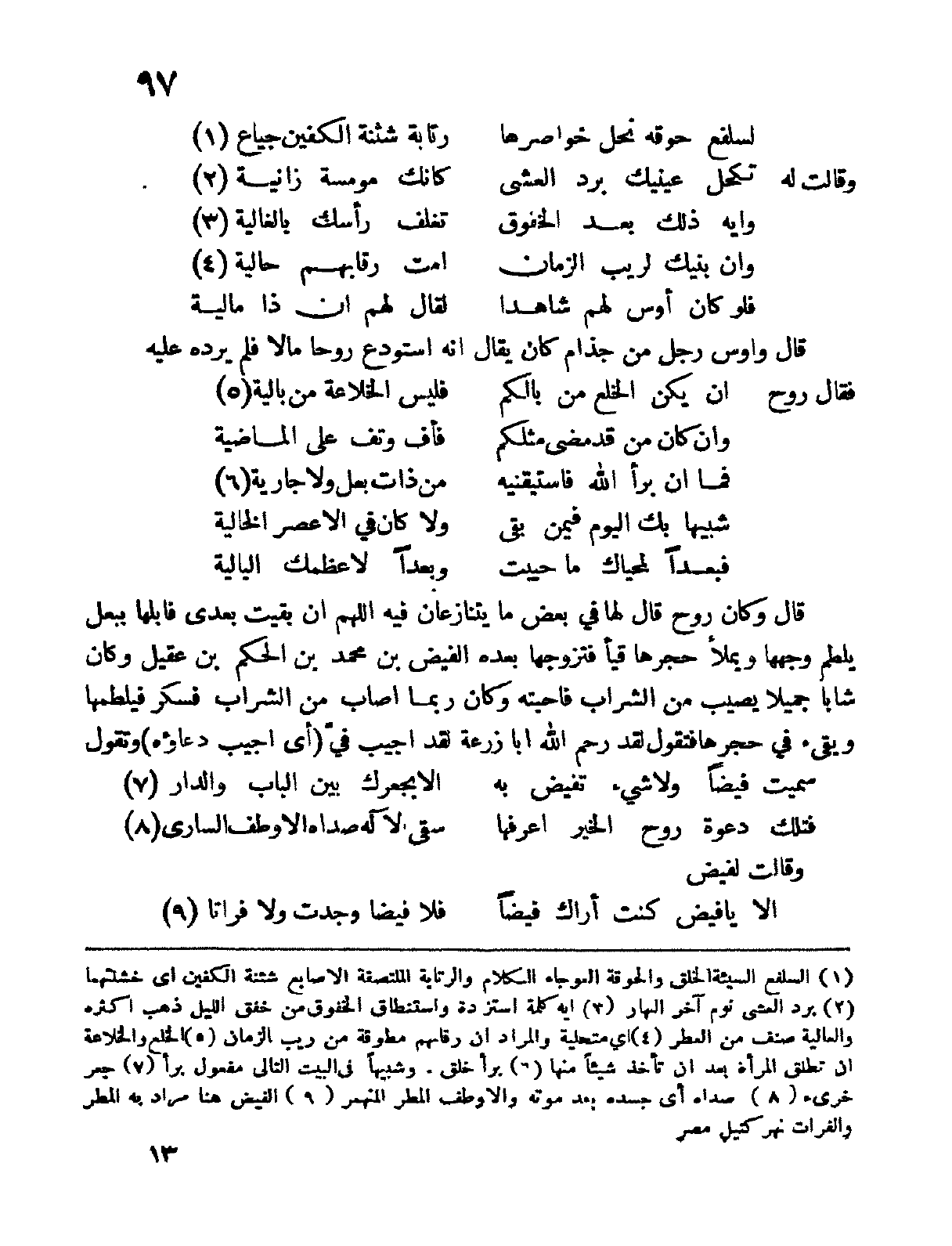 قال وكان روح قال لها في بعض ما يتنازعان فيه اللهم إن بقيت بعدي فابلها ببعل يلطم وجهها ويملأ حجرها قيأ فتزوجها بعده الفيض بن محمد بن الحكم بن عقيل وكان شاباً جميلاً يصيب من الشراب فأحبته وكان ربما أصاب من الشراب فسكر فيلطمها ويقيء في حجرها فتقول رحم الله أبا زرعة لقد أجيب في " أي أجيب دعاؤه " وتقول: