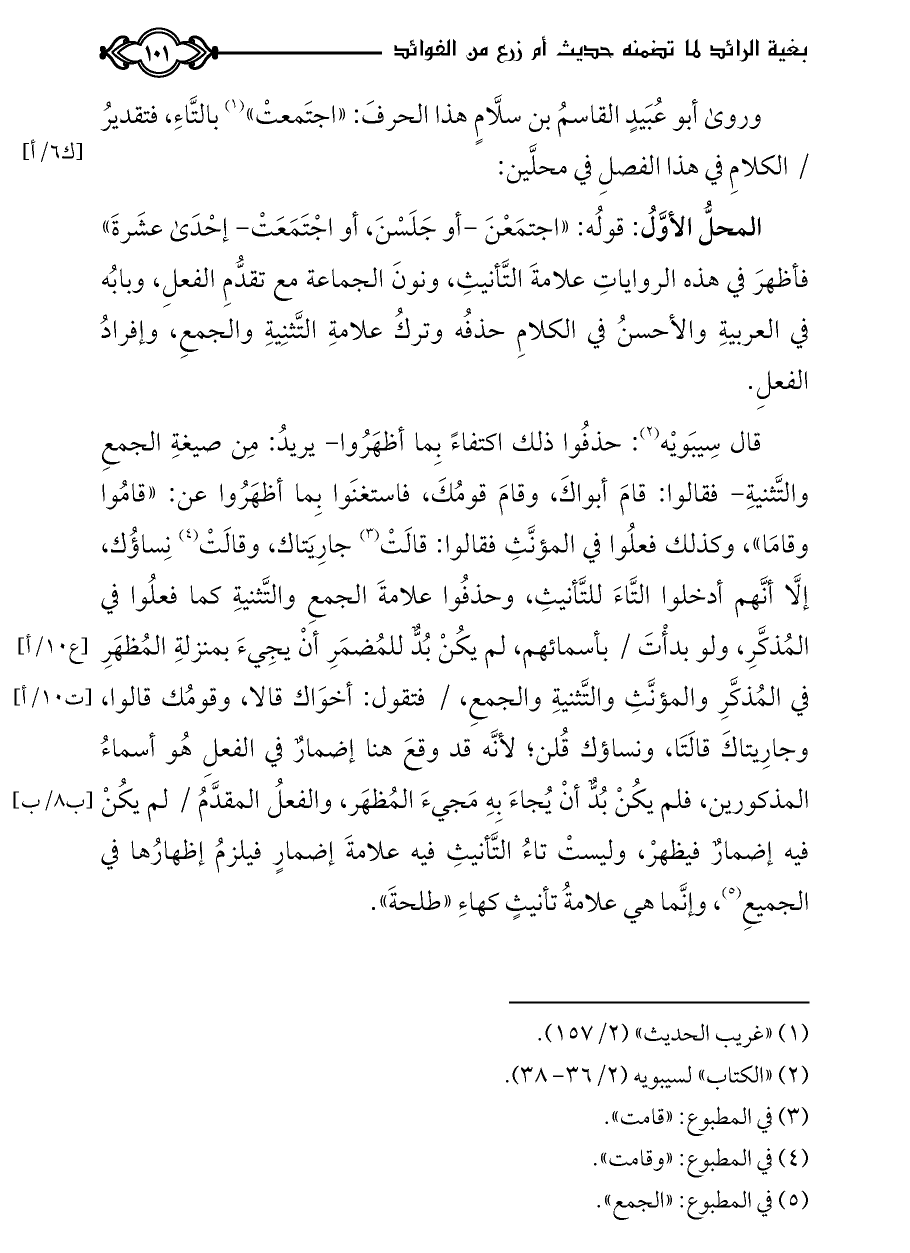 وروى أبو عُبَيدٍ القاسمُ بن سلَّامٍ هذا الحرفَ: «اجتَمعتْ» (¬١) بالتَّاءِ، فتقديرُ / الكلامِ في هذا الفصلِ في محلَّين: