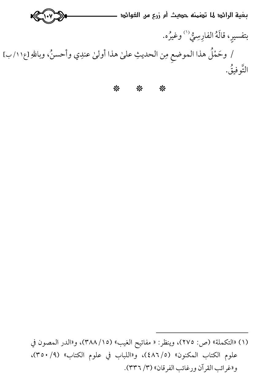 (¬١) «التكملة» (ص: ٢٧٥)، وينظر: «مفاتيح الغيب» (١٥/ ٣٨٨)، و «الدر المصون في علوم الكتاب المكنون» (٥/ ٤٨٦)، و «اللباب في علوم الكتاب» (٩/ ٣٥٠)، و «غرائب القرآن ورغائب الفرقان» (٣/ ٣٣٦).