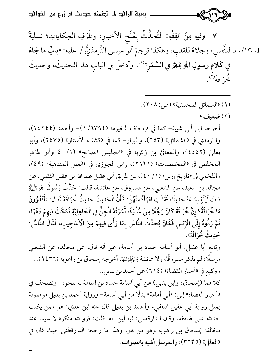 أخرجه ابن أبي شيبة- كما في «إتحاف الخيرة» (٦٣٩٤/ ١) - وأحمد (٢٥٢٤٤)، والترمذي في «الشمائل» (٢٥٣)، والبزار- كما في «كشف الأستار» (٢٤٧٥)، وأبو يعلى (٤٤٤٢)، والمعافى بن زكريا في «الجليس الصالح» (١/ ٤٠ وأبو طاهر المخلص في «المخلصيات» (٢٦٢١)، وابن الجوزي في «العلل المتناهية» (٤٩)، واللخمي في «تاريخ إربل» (١/ ٤٠)، من طريق أبي عقيل عبد الله بن عقيل الثقفي، عن مجالد بن سعيد، عن الشعبي، عن مسروق، عن عائشة، قالت: حَدَّثَ رَسُولُ اللَّهِ - صلى الله عليه وسلم - ذَاتَ لَيْلَةٍ نِسَاءَهُ حَدِيثًا، فَقَالَتِ امْرَأَةٌ مِنْهُنَّ: كَأَنَّ الْحَدِيثَ حَدِيثُ خُرَافَةَ فَقال: «أَتَدْرُونَ مَا خُرَافَةُ؟ إِنَّ خُرَافَةَ كَانَ رَجُلًا مِنْ عُذْرَةَ، أَسَرَتْهُ الْجِنُّ في الْجَاهِلِيَّةِ فَمَكَثَ فيهِمْ دَهْرًا، ثُمَّ رَدُّوهُ إِلَى الْإِنْسِ فَكَانَ يُحَدِّثُ النَّاسَ بِمَا رَأَى فيهِمْ مِنَ الْأَعَاجِيبِ، فَقَالَ النَّاسُ: حَدِيثُ خُرَافَةَ».