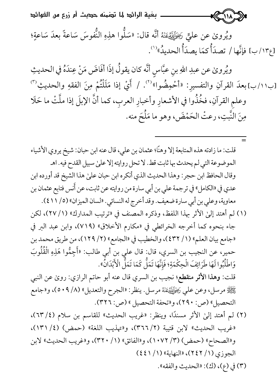 (¬١) لم أهتد إلى الأثر بهذا اللفظ، وذكره المصنف في «ترتيب المدارك» (١/ ٢٧)، لكن جاء بنحوه كما أخرجه الخرائطي في «مكارم الأخلاق» (٧١٩)، وابن عبد البر في «جامع بيان العلم» (١/ ٤٣٢)، والخطيب في «الجامع» (٢/ ١٢٩)، من طريق محمد بن حمير، عن النجيب بن السري، قال: قال علي بن أبي طالب: «أَجِمُّوا هَذِهِ الْقُلُوبَ وَاطْلُبُوا لَهَا طَرَائِفَ الْحِكْمَةِ؛ فَإِنَّهَا تَمَلُّ كَمَا تَمَلُّ الْأَبْدَانُ».