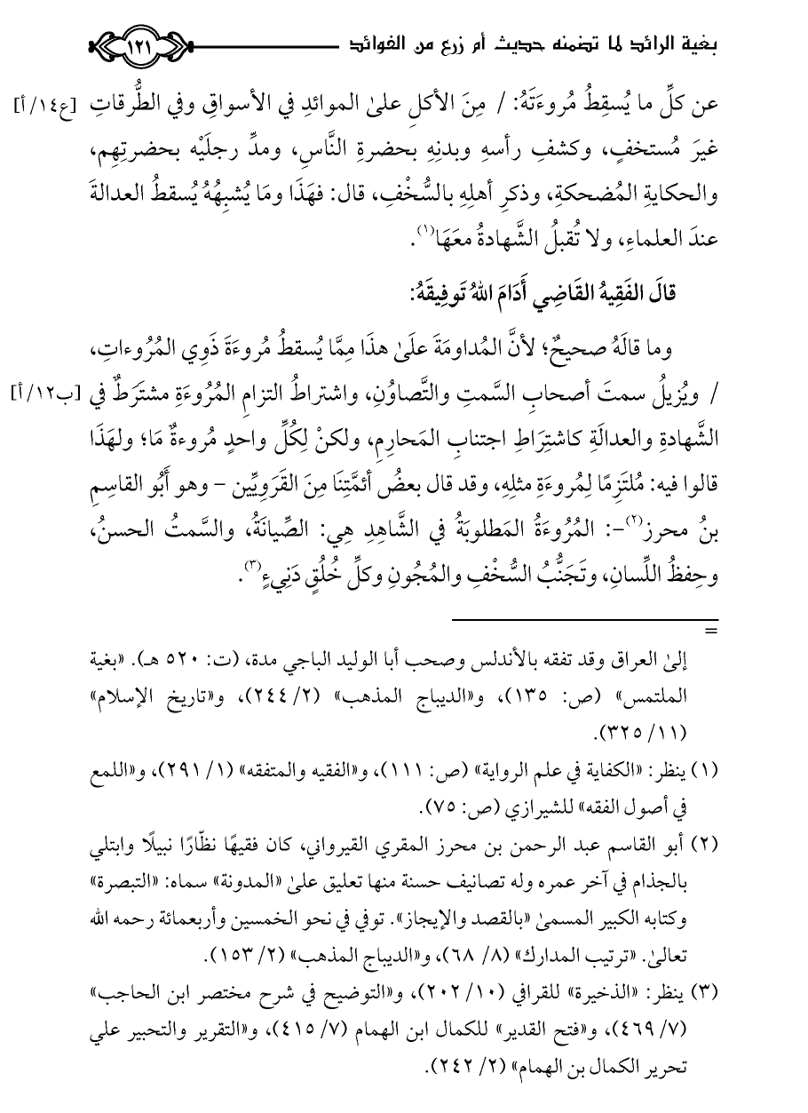 وما قالَهُ صحيحٌ؛ لأنَّ المُداومَةَ علَى هذَا مِمَّا يُسقطُ مُروءَةَ ذَوِي المُرُوءاتِ، / ويُزيلُ سمتَ أصحابِ السَّمتِ والتَّصاوُنِ، واشتراطُ التزامِ المُرُوءَةِ مشتَرَطٌ في الشَّهادةِ والعدالَةِ كاشتِرَاطِ اجتنابِ المَحارِمِ، ولكنْ لِكُلِّ واحدٍ مُروءةٌ مَا؛ ولهَذَا قالوا فيه: مُلتَزِمًا لِمُروءَةِ مثلِهِ، وقد قال بعضُ أئمَّتِنَا مِنَ القَرَوِيِّين - وهو أَبُو القاسِمِ بنُ محرز (¬٢) -: المُرُوءَةُ المَطلوبَةُ في الشَّاهِدِ هِي: الصِّيانَةُ، والسَّمتُ الحسنُ، وحِفظُ اللِّسانِ، وتَجَنُّبُ السُّخْفِ والمُجُونِ وكلِّ خُلُقٍ دَنِيءٍ (¬٣).