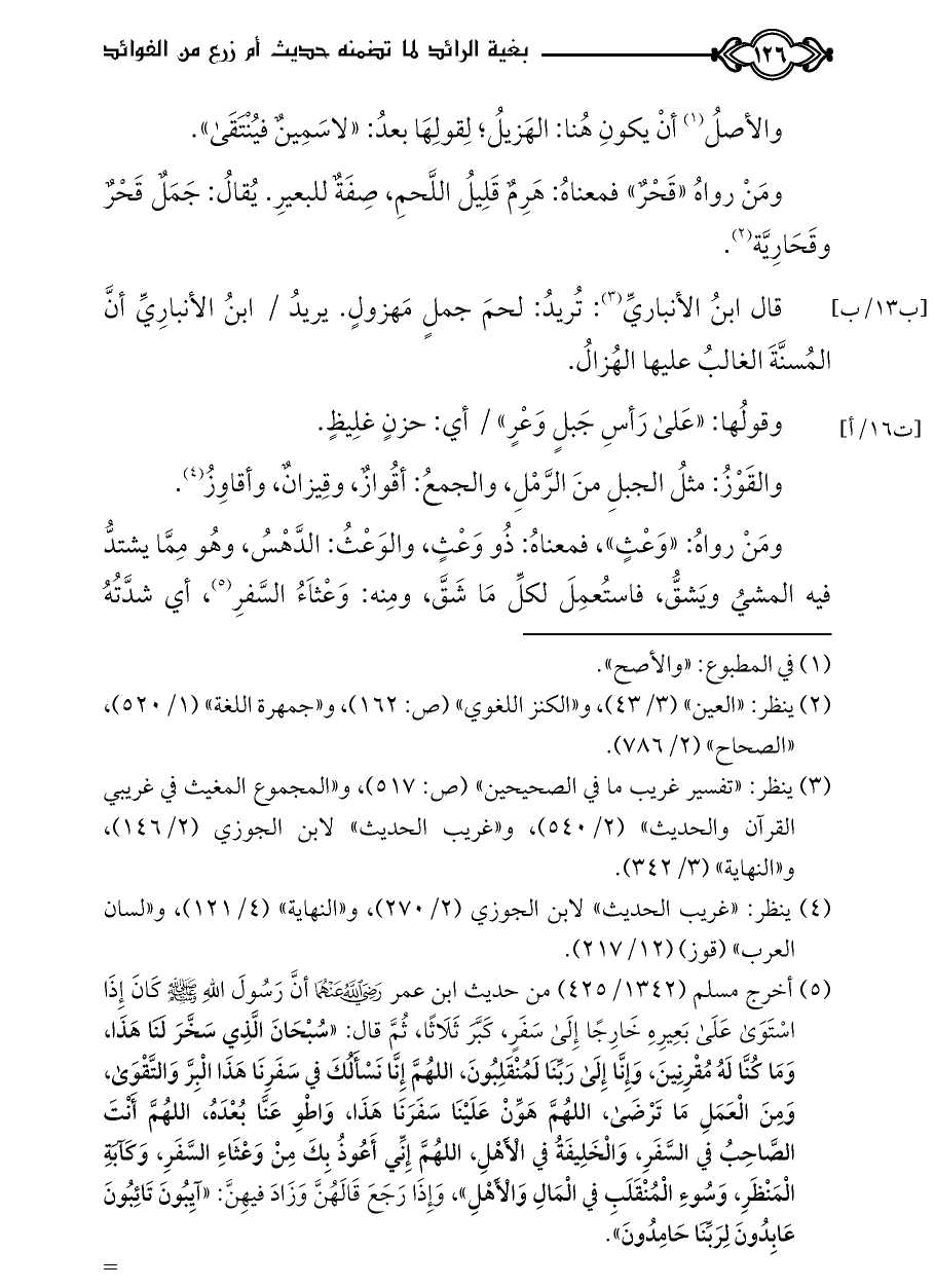(¬٣) ينظر: «تفسير غريب ما في الصحيحين» (ص: ٥١٧)، و «المجموع المغيث في غريبي القرآن والحديث» (٢/ ٥٤٠)، و «غريب الحديث» لابن الجوزي (٢/ ١٤٦)، و «النهاية» (٣/ ٣٤٢).