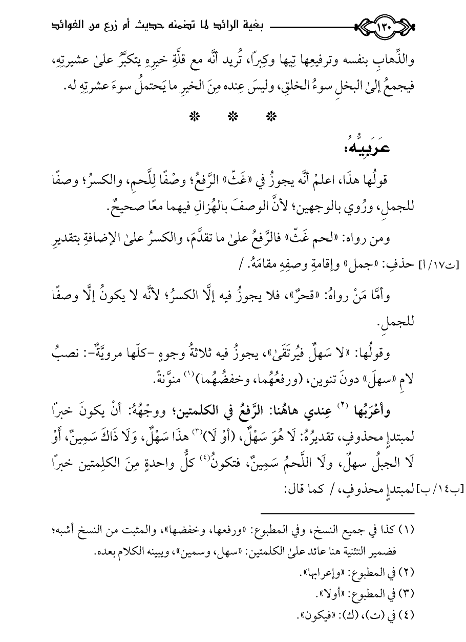 (¬١) كذا في جميع النسخ، وفي المطبوع: «ورفعها، وخفضها»، والمثبت من النسخ أشبه؛ فضمير التثنية هنا عائد على الكلمتين: «سهل، وسمين»، ويبينه الكلام بعده.