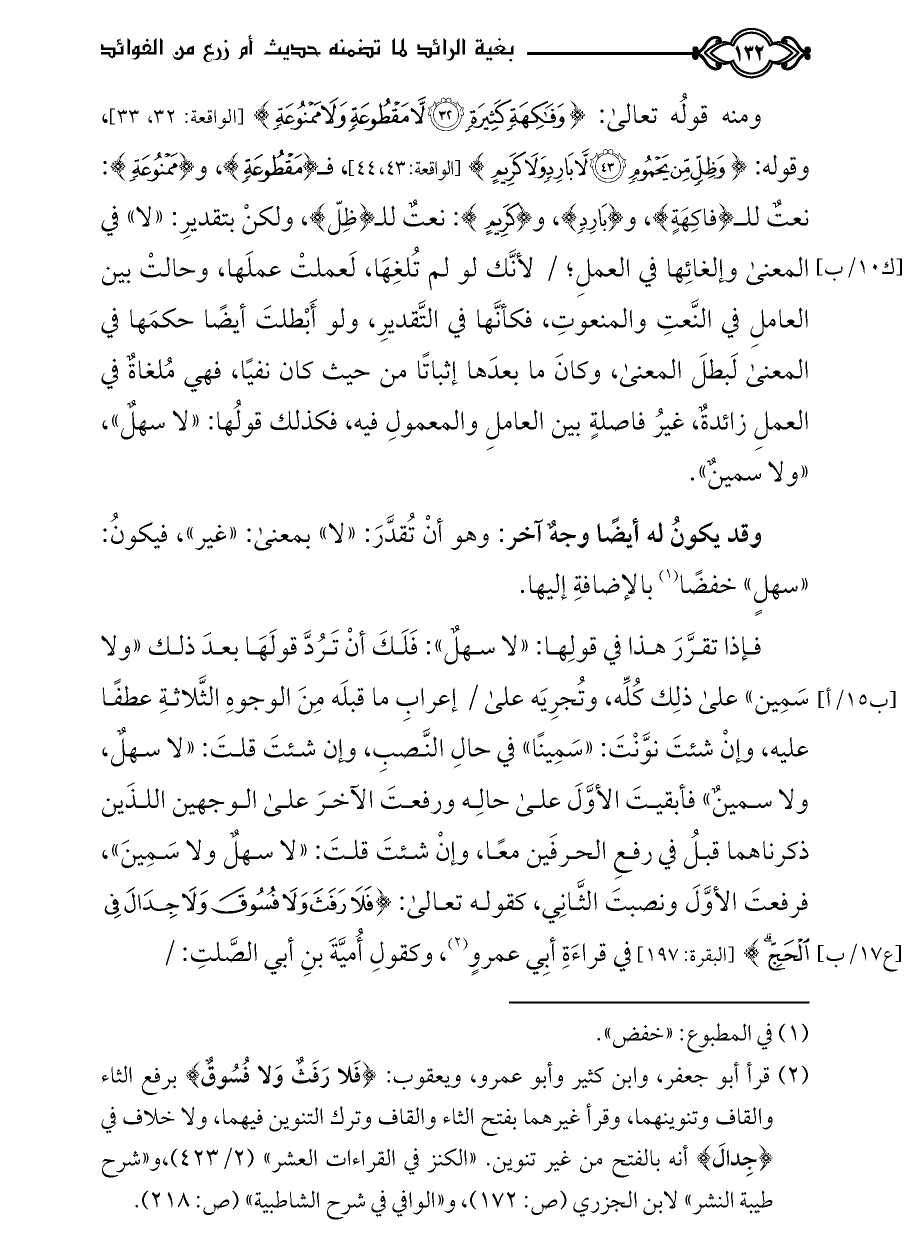 ومنه قولُه تعالى: {وَفَاكِهَةٍ كَثِيرَةٍ (٣٢) لَا مَقْطُوعَةٍ وَلَا مَمْنُوعَةٍ} [الواقعة: ٣٢، ٣٣]، وقوله: {وَظِلٍّ مِنْ يَحْمُومٍ (٤٣) لَا بَارِدٍ وَلَا كَرِيمٍ} [الواقعة: ٤٣، ٤٤]، فـ {مَقْطُوعَةٍ}، و {مَمْنُوعَةٍ}: نعتٌ للـ {فاكِهَةٍ}، و {بَارِدٍ}، و {كَرِيمٍ}: نعتٌ للـ {ظِلّ}، ولكنْ بتقديرِ: «لا» في المعنى وإلغائِها في العملِ؛ / لأنَّك لو لم تُلغِهَا، لَعملتْ عملَها، وحالتْ بين العاملِ في النَّعتِ والمنعوتِ، فكأنَّها في التَّقديرِ، ولو أَبْطلتَ أيضًا حكمَها في المعنى لَبطلَ المعنى، وكانَ ما بعدَها إثباتًا من حيث كان نفيًا، فهي مُلغاةٌ في العملِ زائدةٌ، غيرُ فاصلةٍ بين العاملِ والمعمولِ فيه، فكذلك قولُها: «لا سهلٌ»، «ولا سمينٌ».