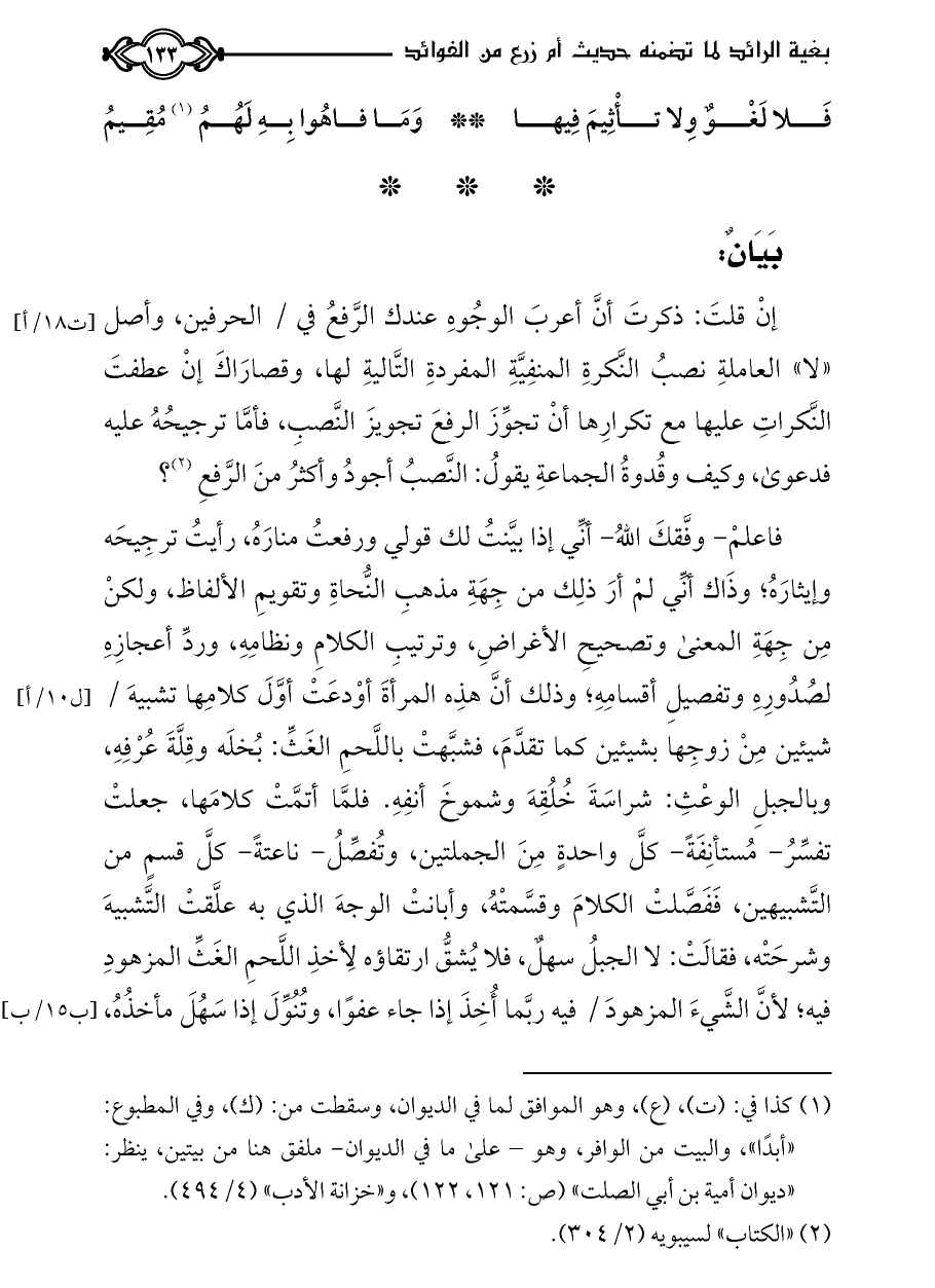 فاعلمْ- وفَّقكَ اللهُ- أنِّي إذا بيَّنتُ لك قولي ورفعتُ منارَهُ، رأيتُ ترجِيحَه وإيثارَهُ؛ وذَاك أنِّي لمْ أرَ ذلِك من جِهَةِ مذهبِ النُّحاةِ وتقويمِ الألفاظ، ولكنْ مِن جِهَةِ المعنى وتصحيحِ الأغراضِ، وترتيبِ الكلامِ ونظامِهِ، وردِّ أعجازِهِ لصُدُورِهِ وتفصيلِ أقسامِهِ؛ وذلك أنَّ هذِه المرأةَ أوْدعَتْ أوَّلَ كلامِها تشبيهَ / شيئين مِنْ زوجِها بشيئين كما تقدَّمَ، فشبَّهتْ باللَّحمِ الغَثِّ: بُخلَه وقِلَّةَ عُرْفِهِ، وبالجبلِ الوعْثِ: شراسَةَ خُلُقِهَ وشموخَ أنفِهِ. فلمَّا أتمَّتْ كلامَها، جعلتْ تفسِّرُ- مُستأنِفَةً- كلَّ واحدةٍ مِنَ الجملتين، وتُفصِّلُ- ناعتةً- كلَّ قسمٍ من التَّشبيهين، فَفَصَّلتْ الكلامَ وقسَّمتْهُ، وأبانتْ الوجهَ الذي به علَّقتْ التَّشبيهَ وشرحَتْه، فقالَتْ: لا الجبلُ سهلٌ، فلا يُشقُّ ارتقاؤه لِأخذِ اللَّحمِ الغَثِّ المزهودِ فيه؛ لأنَّ الشَّيءَ المزهودَ / فيه ربَّما أُخِذَ إذا جاء عفوًا، وتُنُوِّلَ إذا سَهُلَ مأخذُهُ،