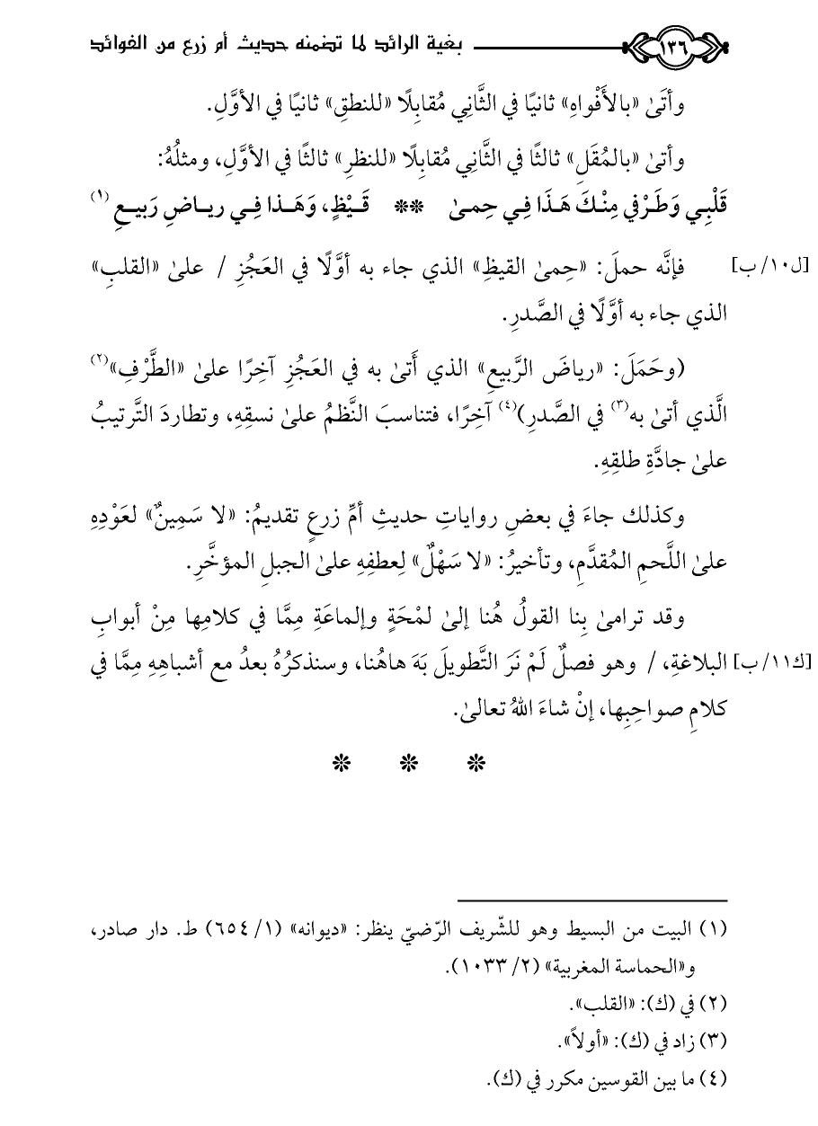 (وحَمَلَ: «رياضَ الرَّبيعِ» الذي أَتى به في العَجُزِ آخِرًا على «الطَّرْفِ» (¬٢) الَّذي أتى به (¬٣) في الصَّدرِ) (¬٤) آخِرًا، فتناسبَ النَّظمُ على نسقِهِ، وتطاردَ التَّرتيبُ على جادَّةِ طلقِهِ.