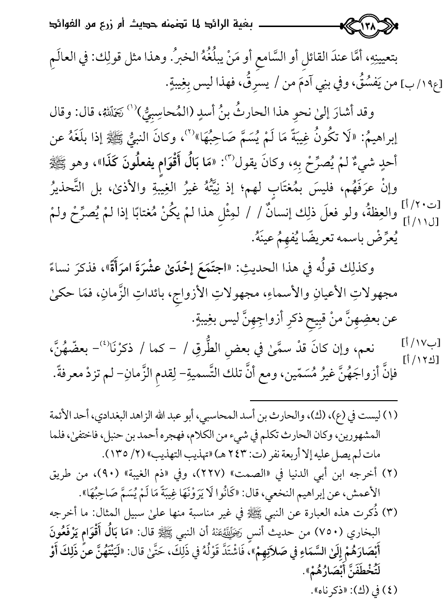 وقد أشارَ إلى نحوِ هذا الحارثُ بنُ أسدٍ (المُحاسِبِيُّ) (¬١) - رحمه الله -، قال: وقال إبراهيمُ: «لَا تكُونُ غِيبَةً مَا لَمْ يُسَمَّ صَاحِبُهَا» (¬٢)، وكانَ النبيُّ - صلى الله عليه وسلم - إذا بلَغَهُ عن أحدٍ شيءٌ لمْ يُصرِّحْ بِهِ، وكانَ يقول (¬٣): «مَا بَالُ أَقْوَامٍ يفعلُونَ كَذَا»، وهو - صلى الله عليه وسلم - وإنْ عرَفَهُم، فليسَ بمُغتَابٍ لهم؛ إذ نِيَّتُهُ غيرُ الغِيبةِ والأذى، بل التَّحذيرُ والعِظةُ، ولو فعلَ ذلِك إنسانٌ / / لمِثْلِ هذا لمْ يكُنْ مُغتابًا إذا لمْ يُصرِّحْ ولمْ يُعرِّضْ باسمه تعريضًا يُفهِمُ عينَهُ.