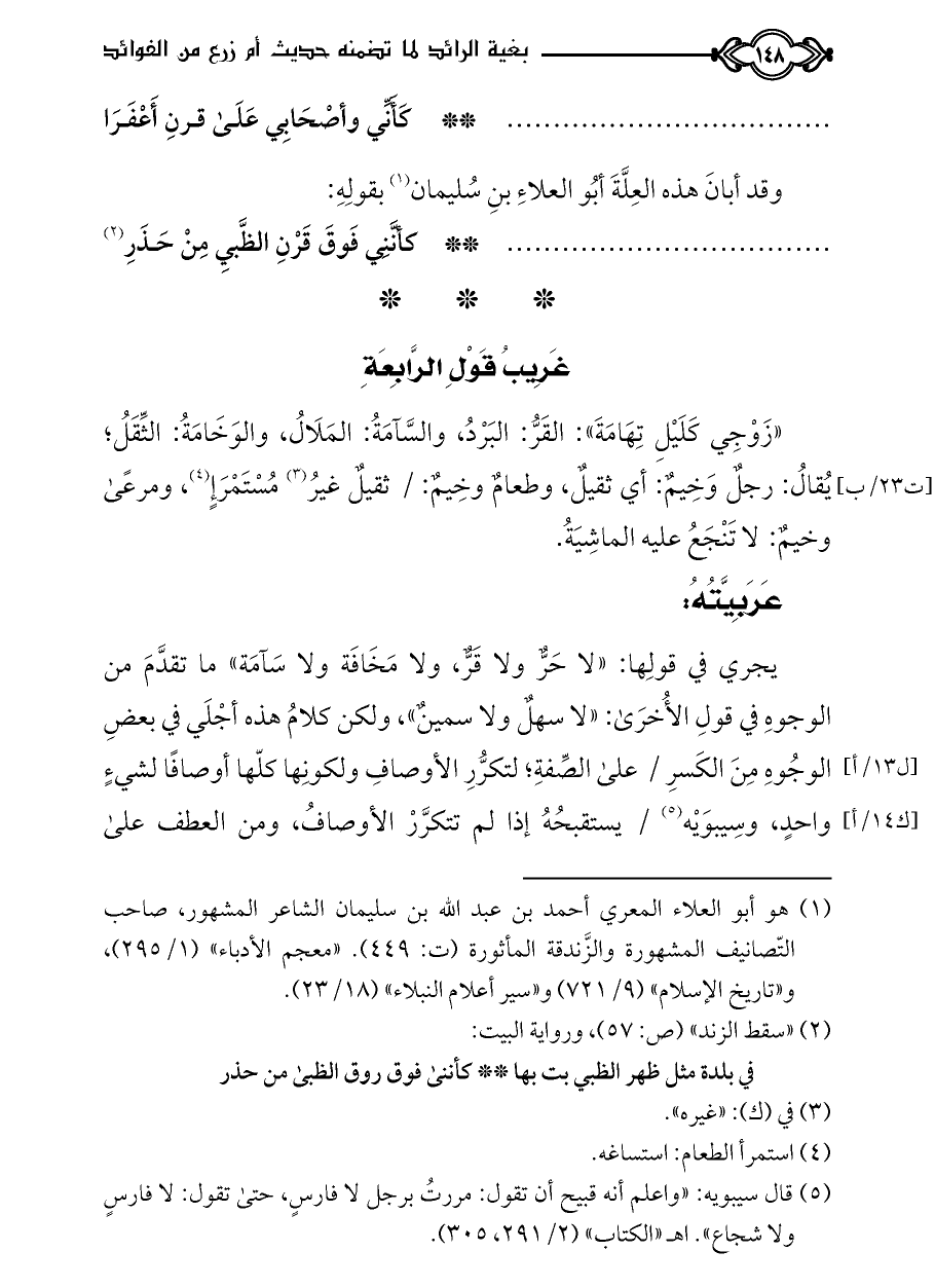 (¬١) هو أبو العلاء المعري أحمد بن عبد اللَّه بن سليمان الشاعر المشهور، صاحب التّصانيف المشهورة والزَّندقة المأثورة (ت: ٤٤٩). «معجم الأدباء» (١/ ٢٩٥)، و «تاريخ الإسلام» (٩/ ٧٢١) و «سير أعلام النبلاء» (١٨/ ٢٣).