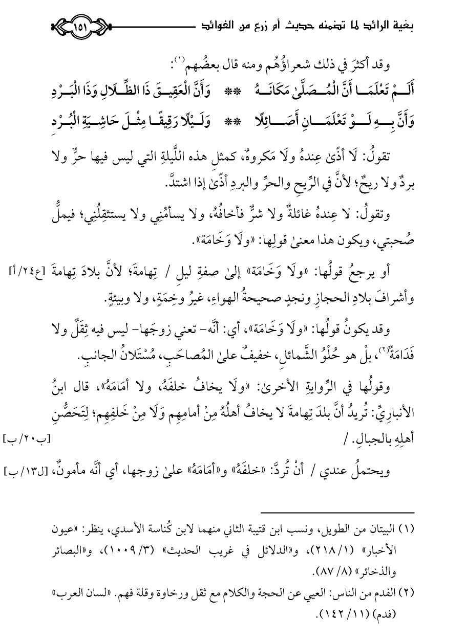 أو يرجعُ قولُها: «ولَا وَخَامَة» إلى صفةِ ليلِ / تِهامةَ؛ لأنَّ بلادَ تِهامةَ وأشرافَ بلادِ الحجازِ ونجدٍ صحيحةُ الهواءِ، غيرُ وخِمَةٍ، ولا وبيئةٍ.